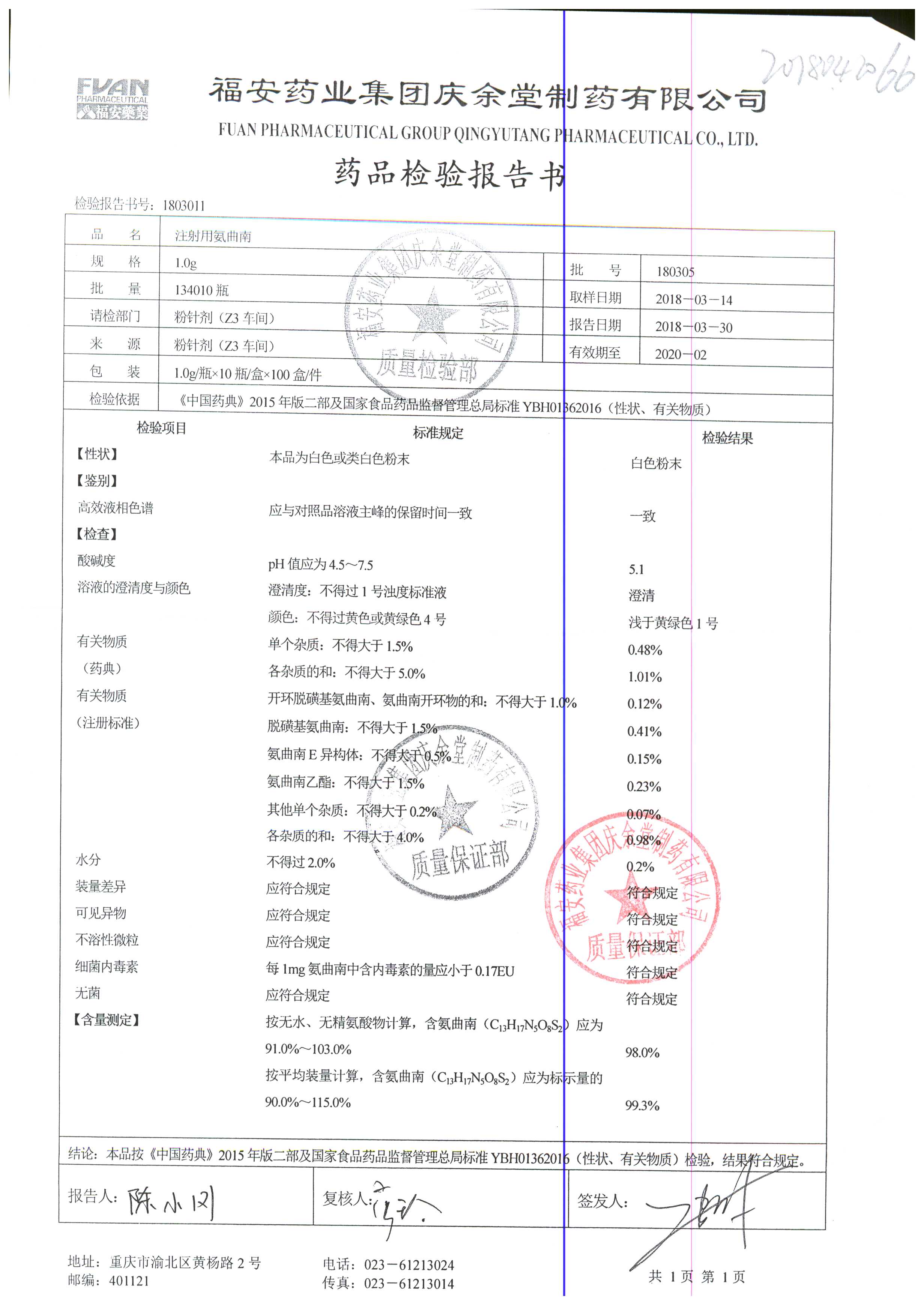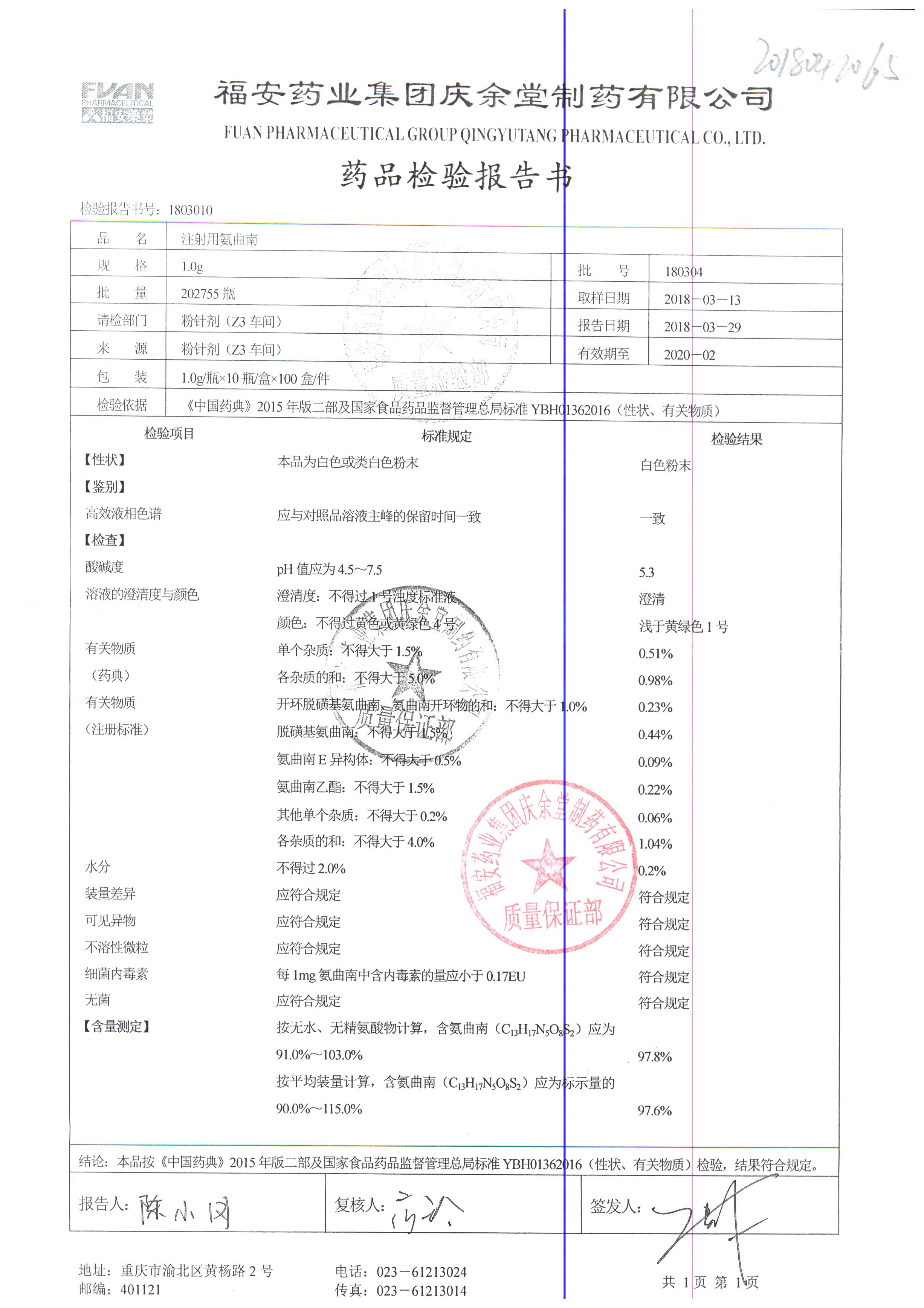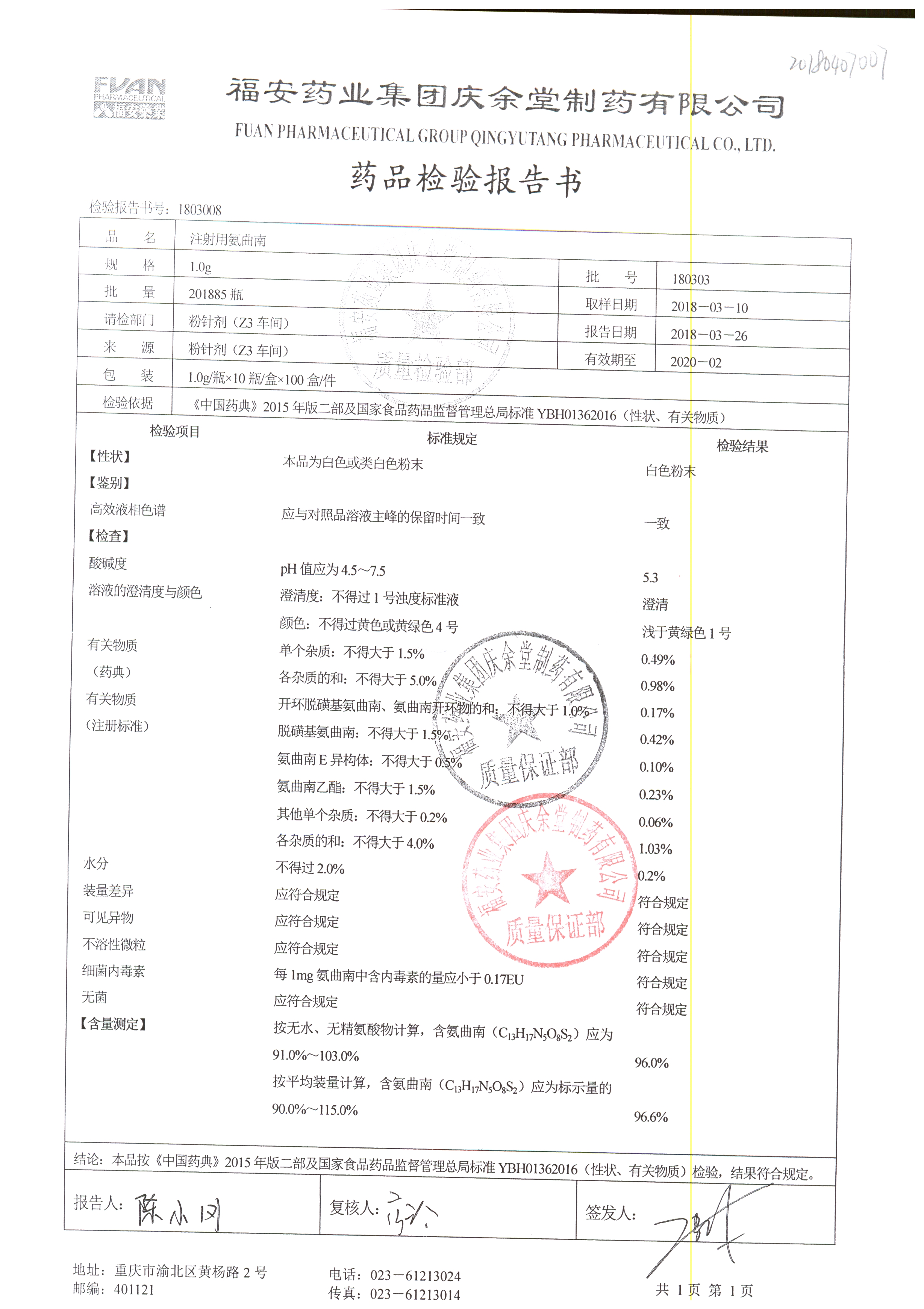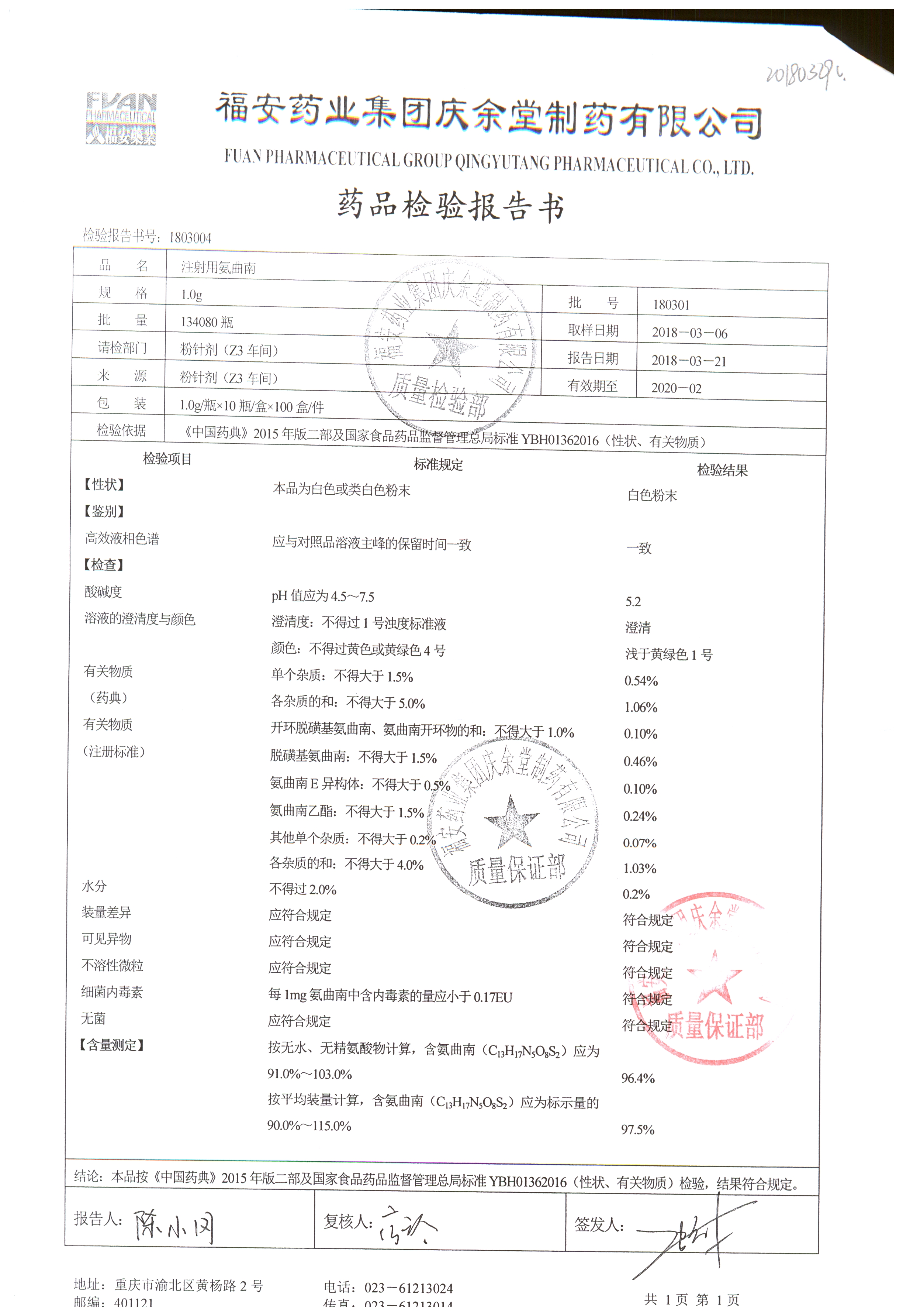| 注射用氨曲南 | 1.0g | 180303 | 查看詳情 |