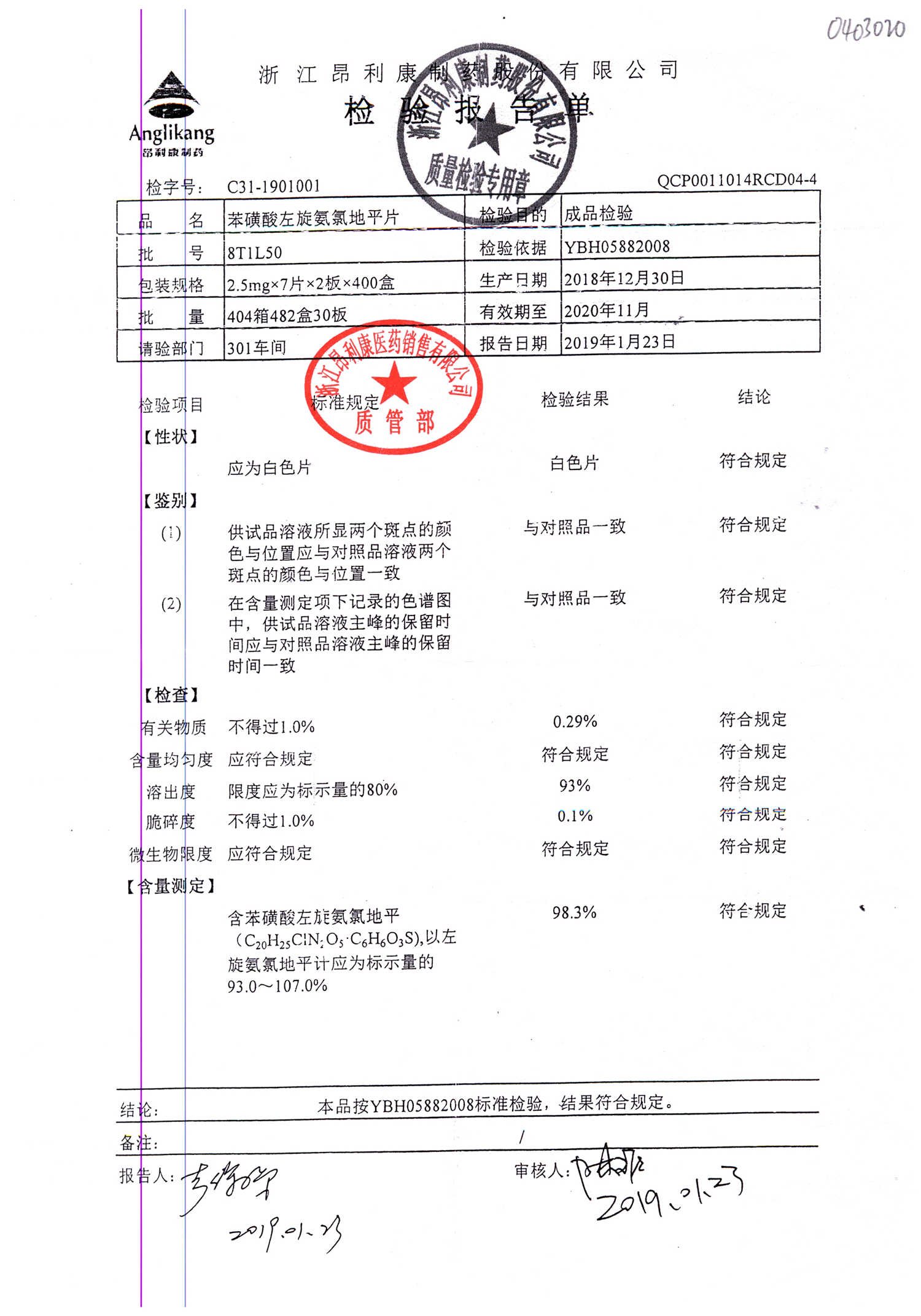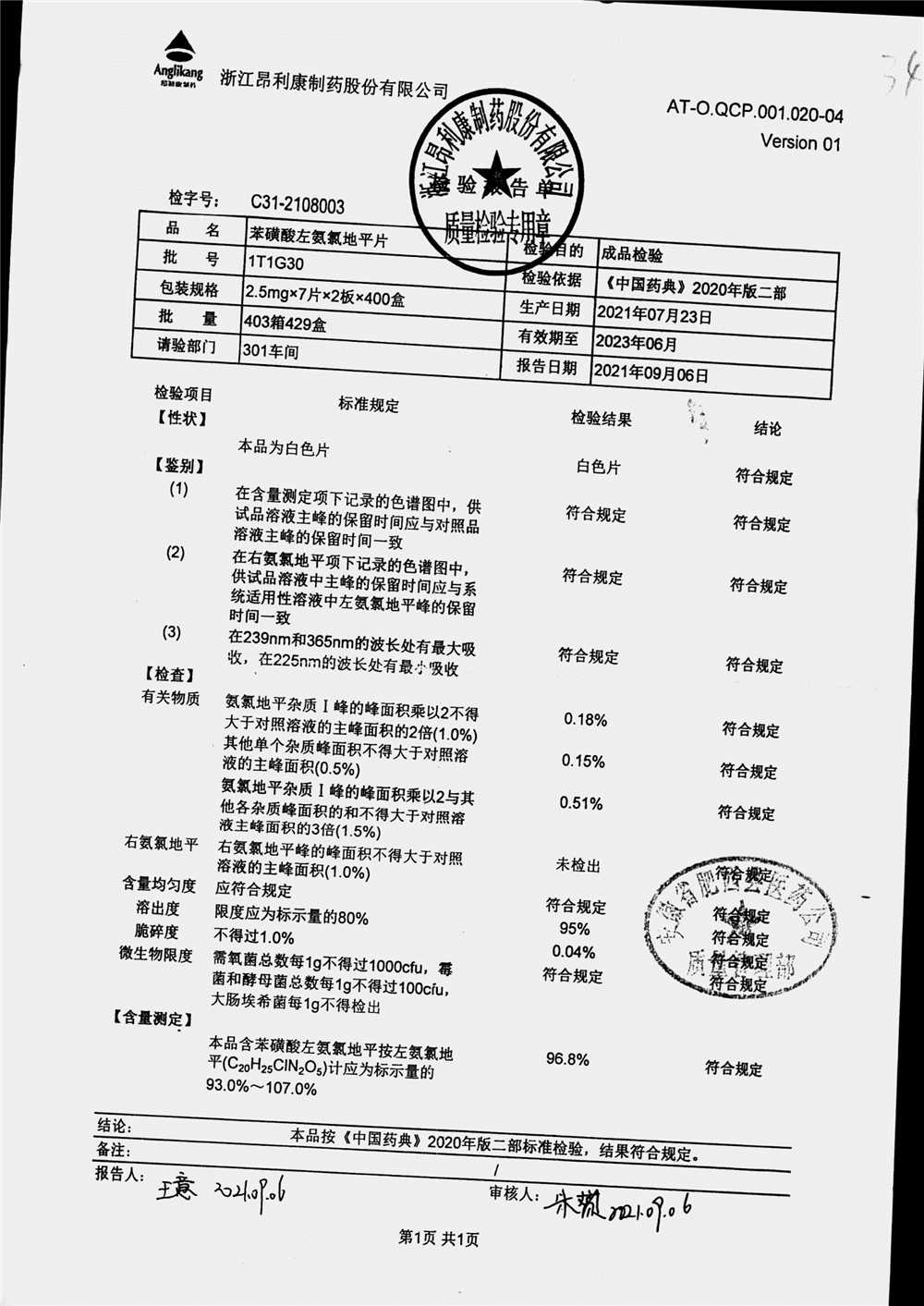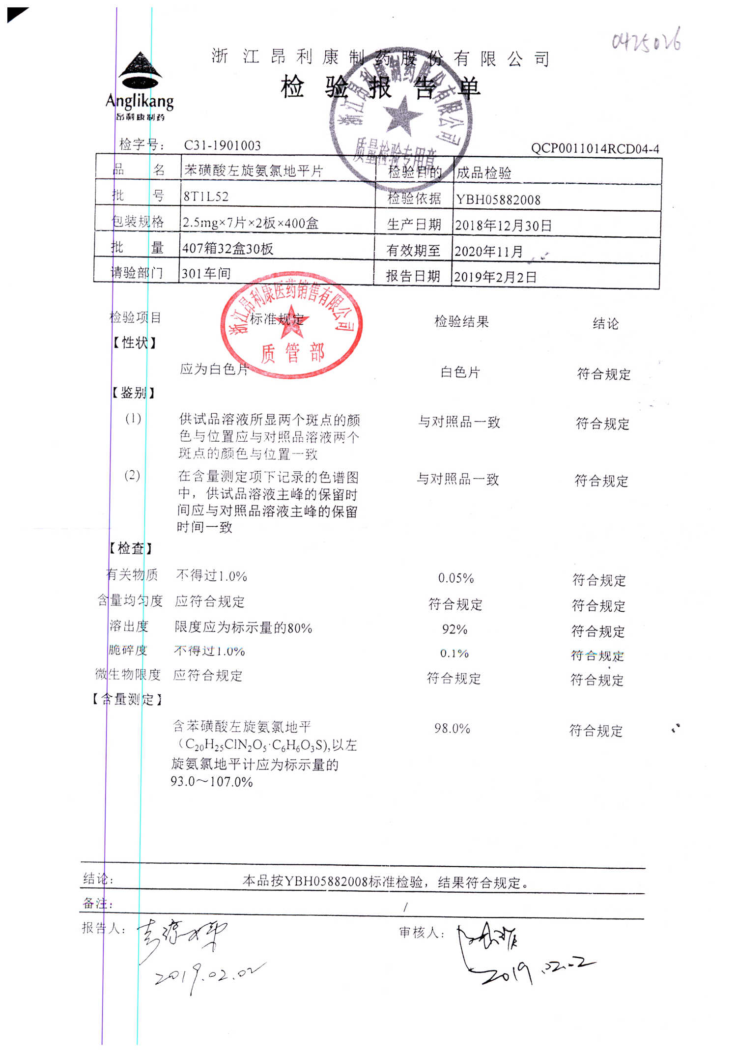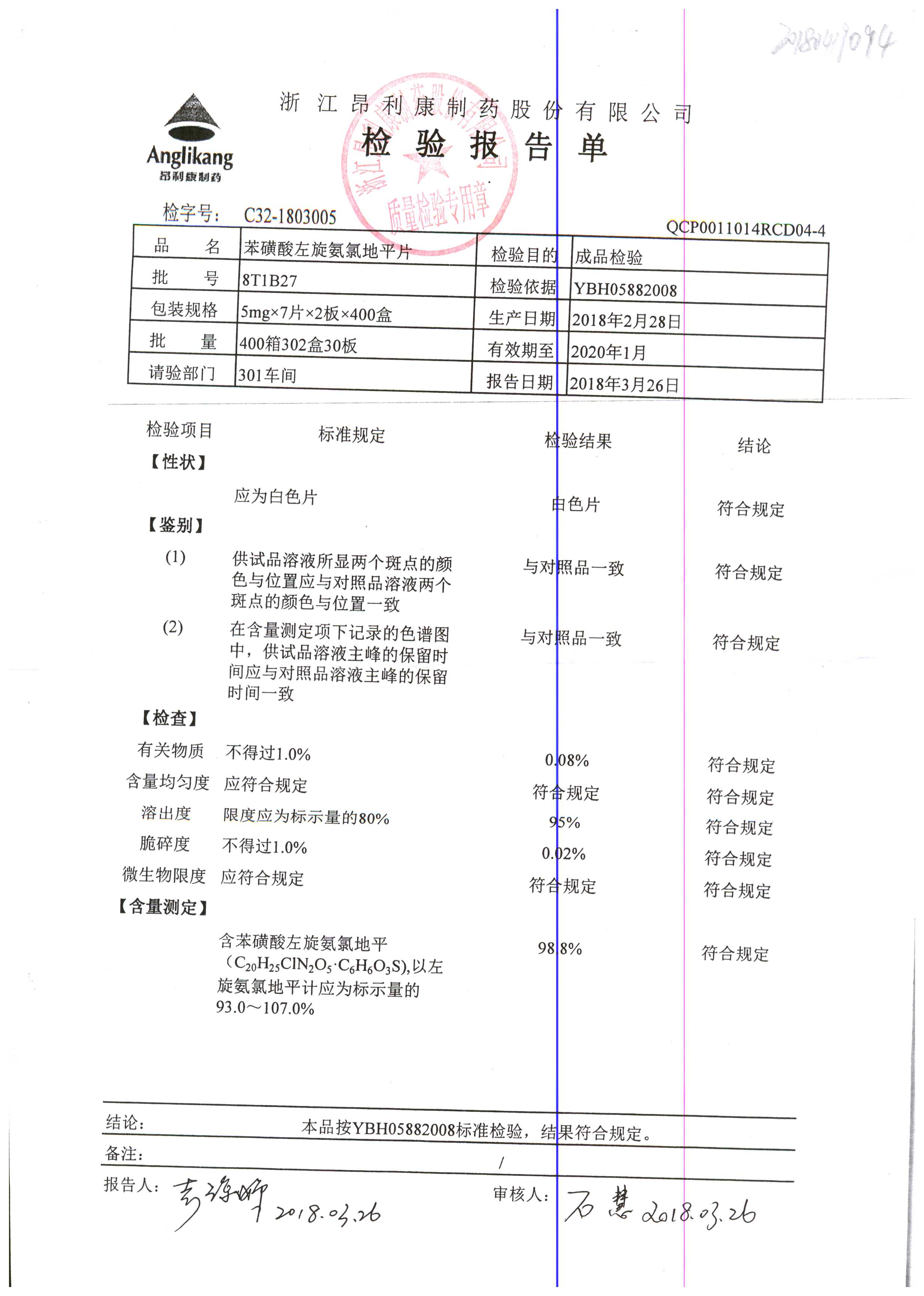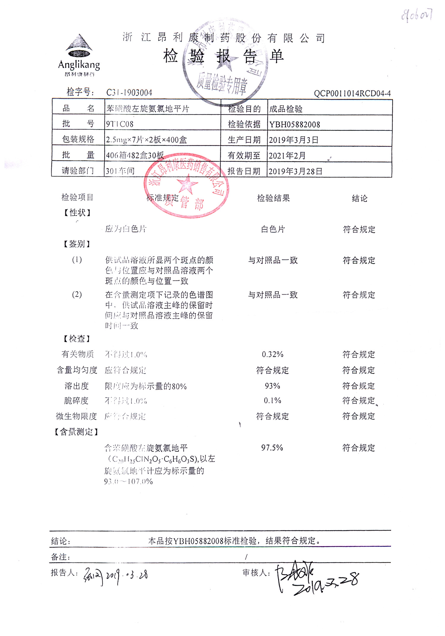 | 苯磺酸左旋氨氯地平片 | 2.5mg*14片 | 8T1L50 | 查看詳情 |