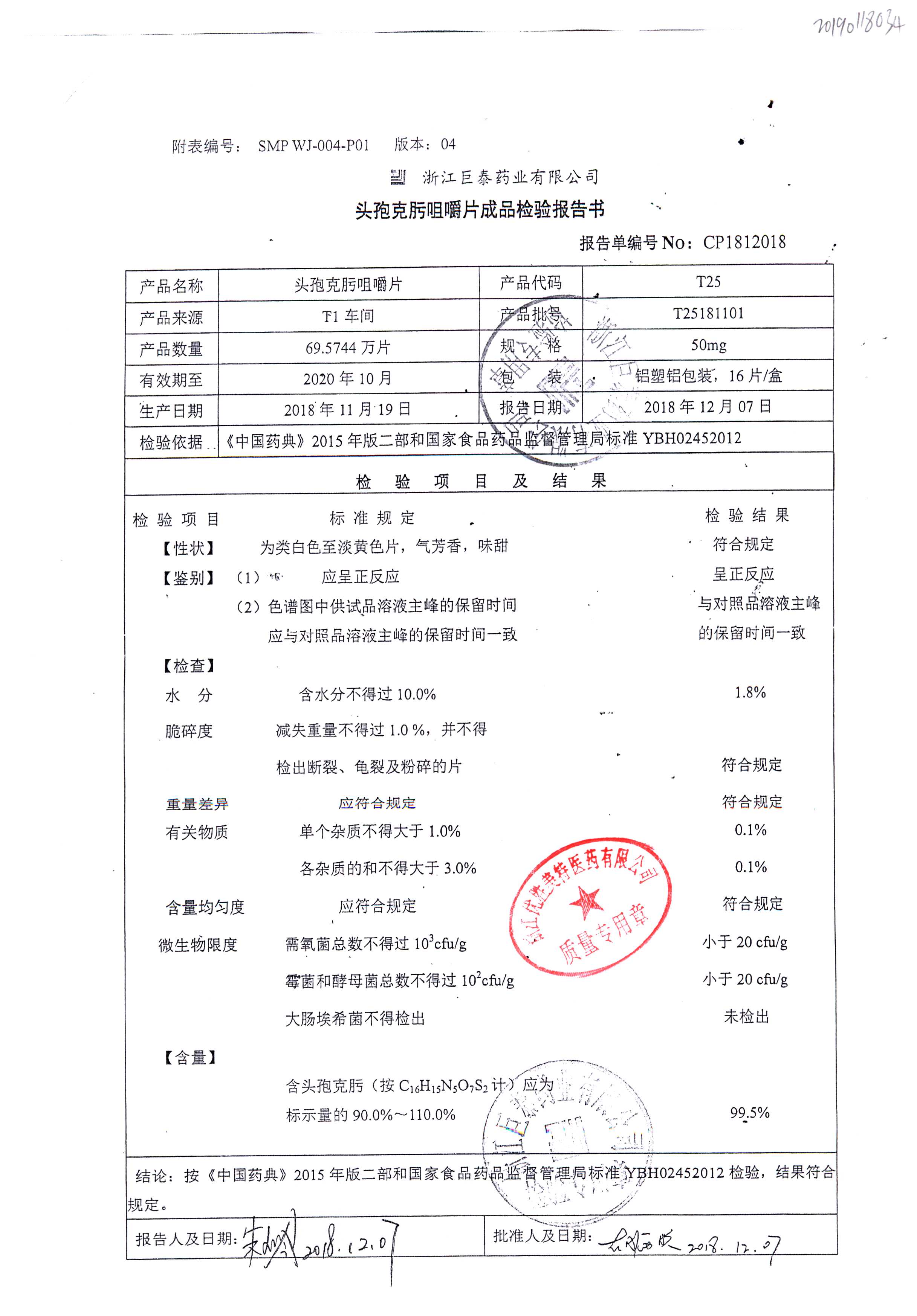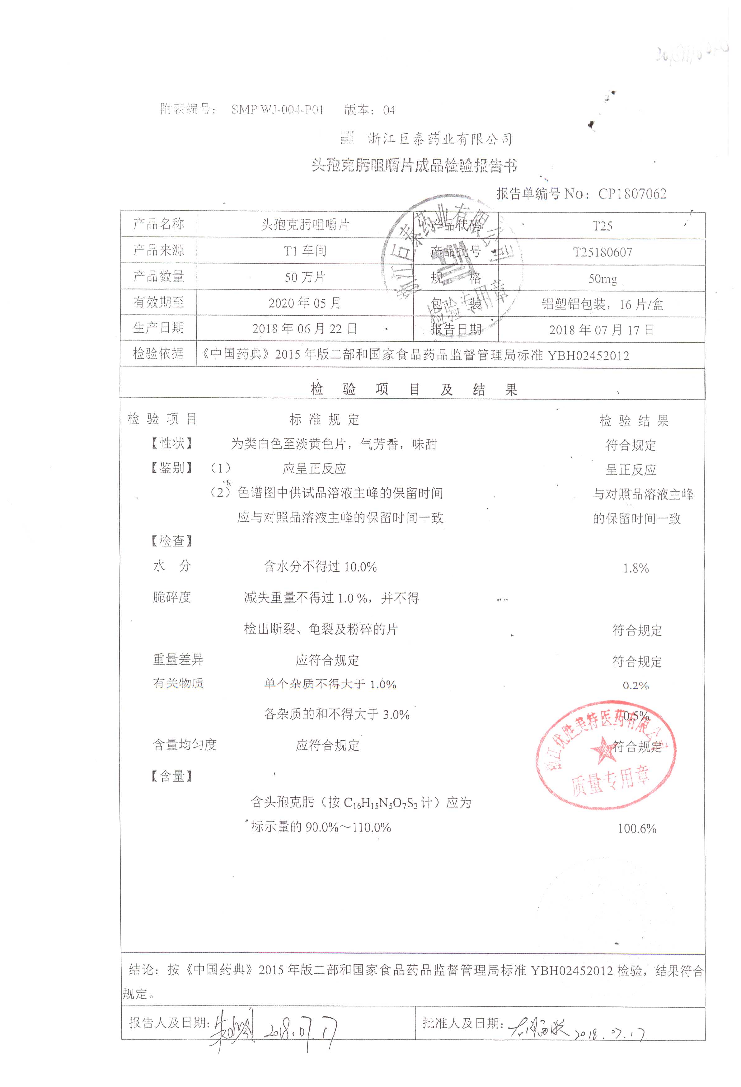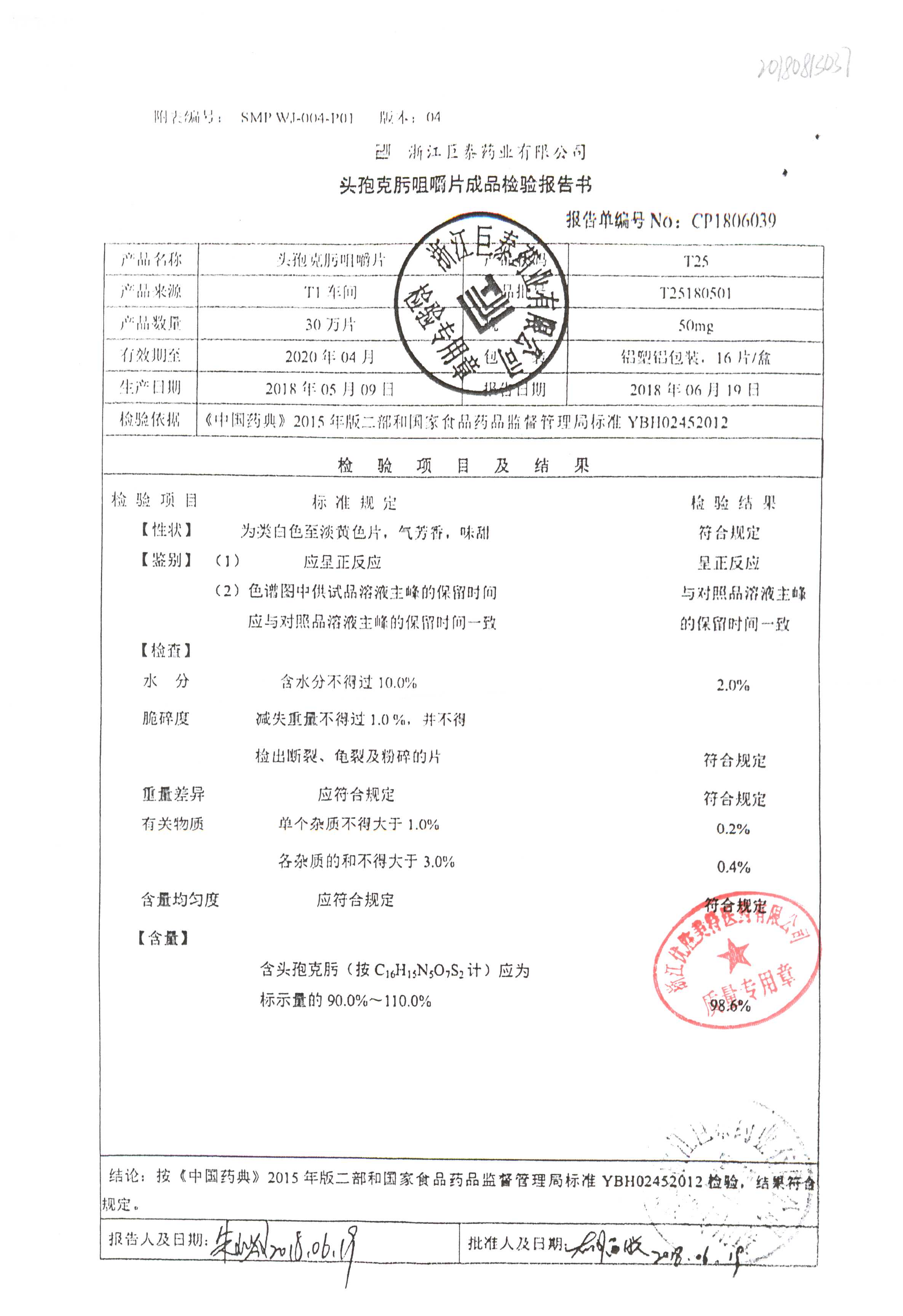 | 頭孢克肟咀嚼片 | 50mg*16s | T25190201 | 查看詳情 |