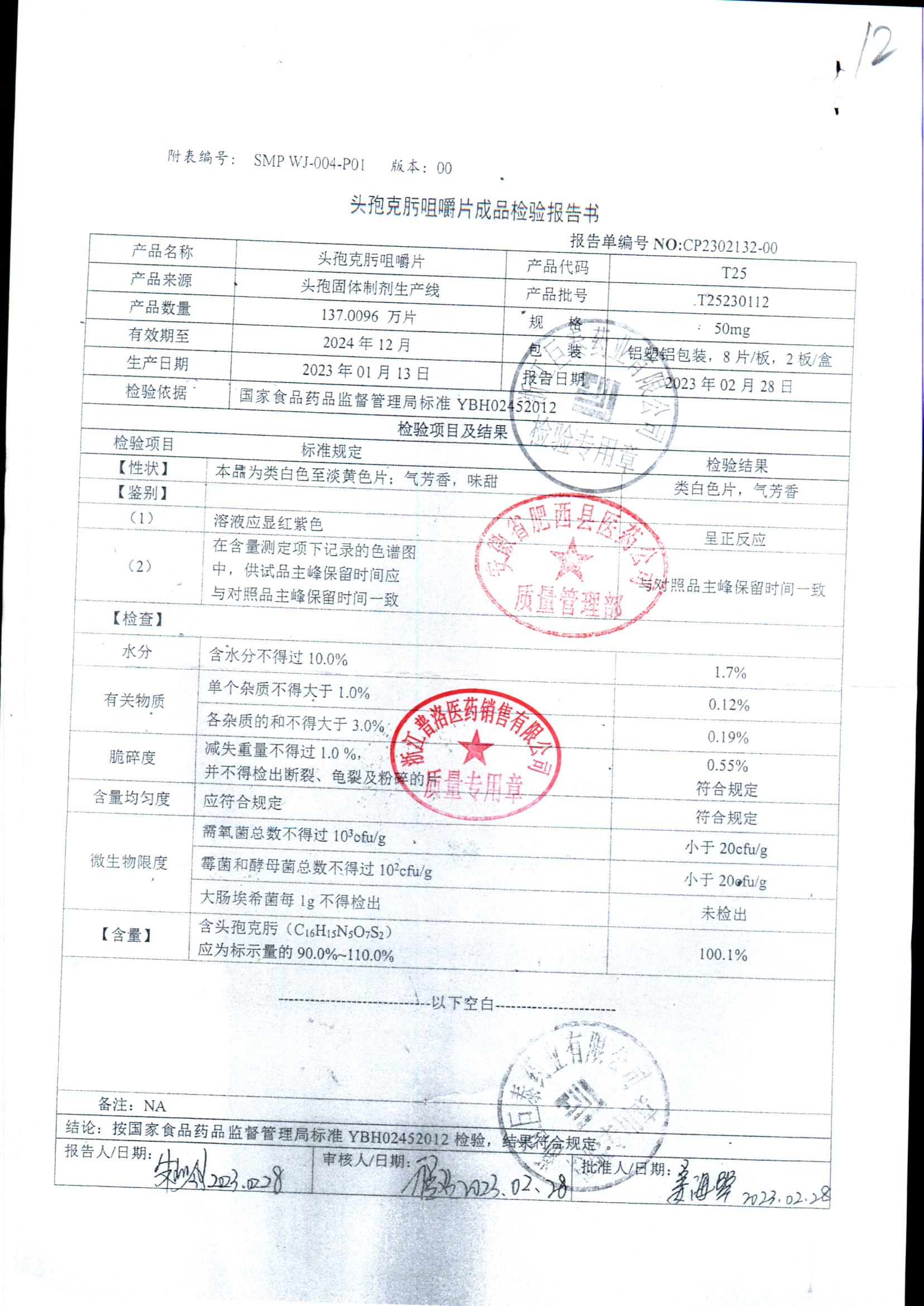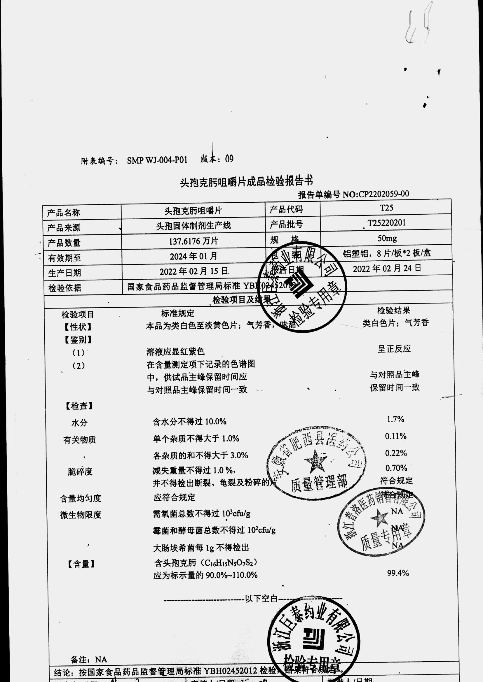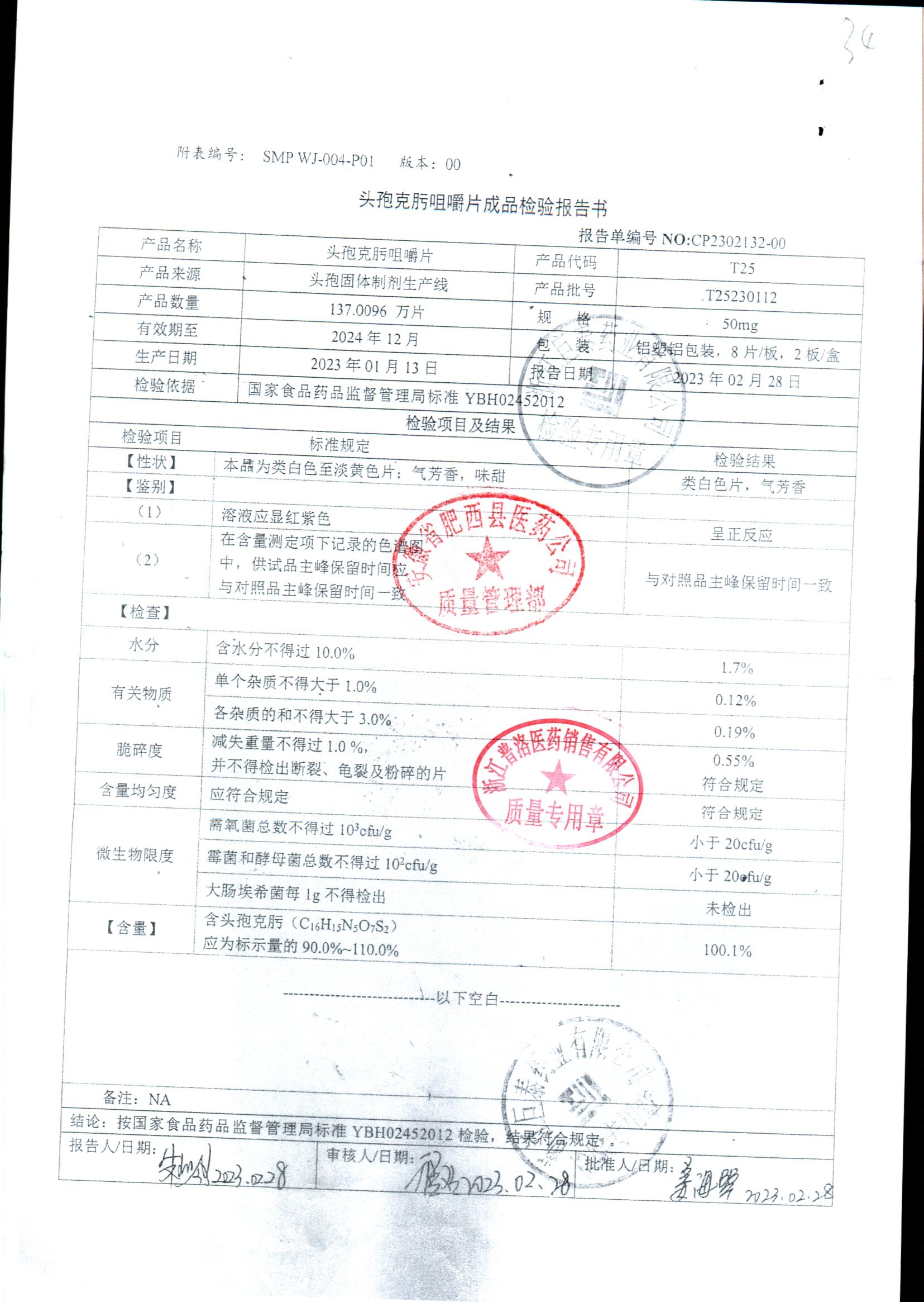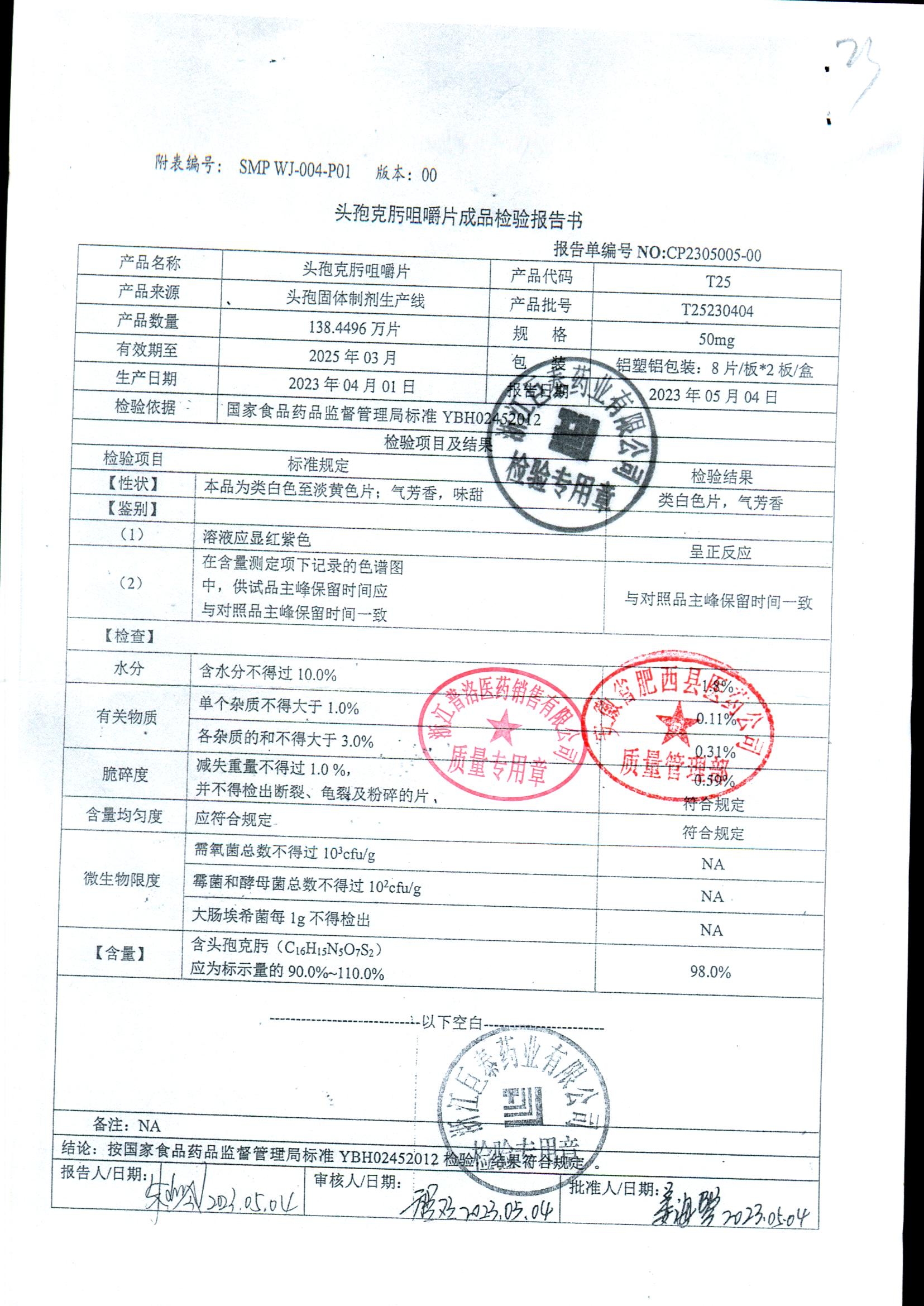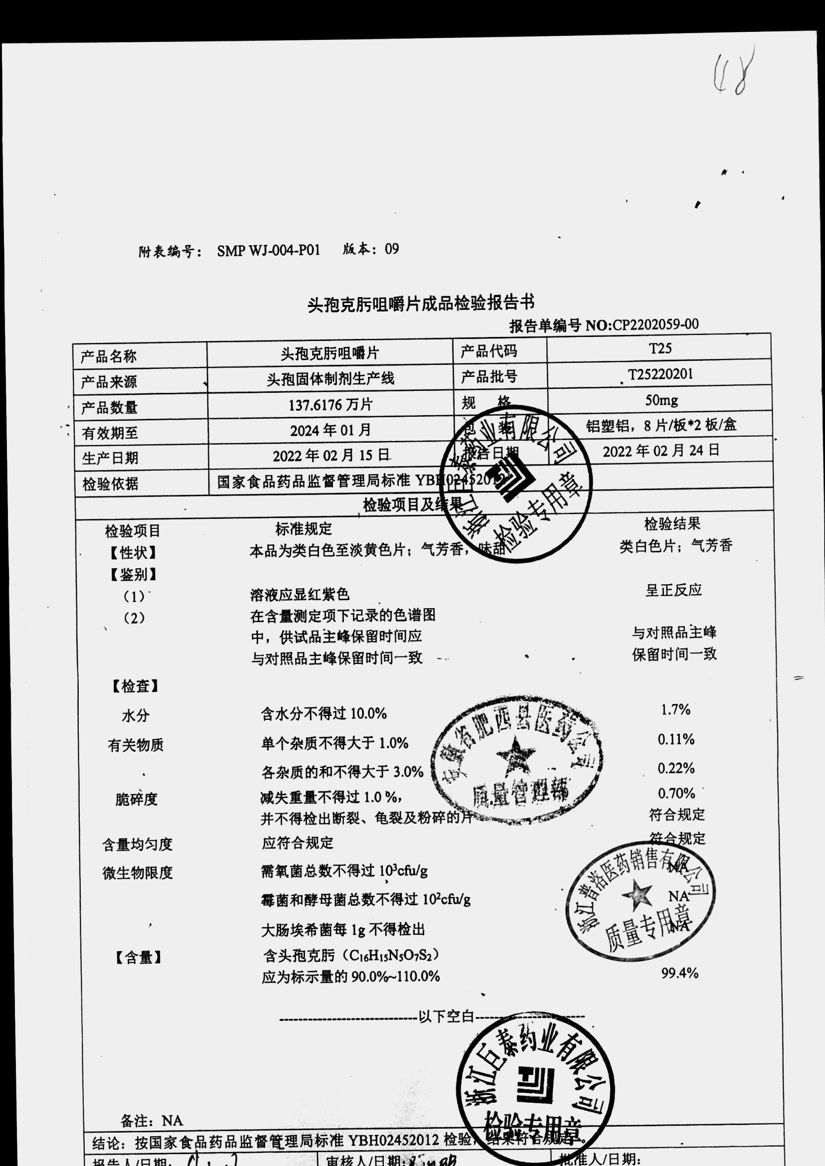 | 頭孢克肟咀嚼片 | 50mg*16s | T25220201/1 | 查看詳情 |