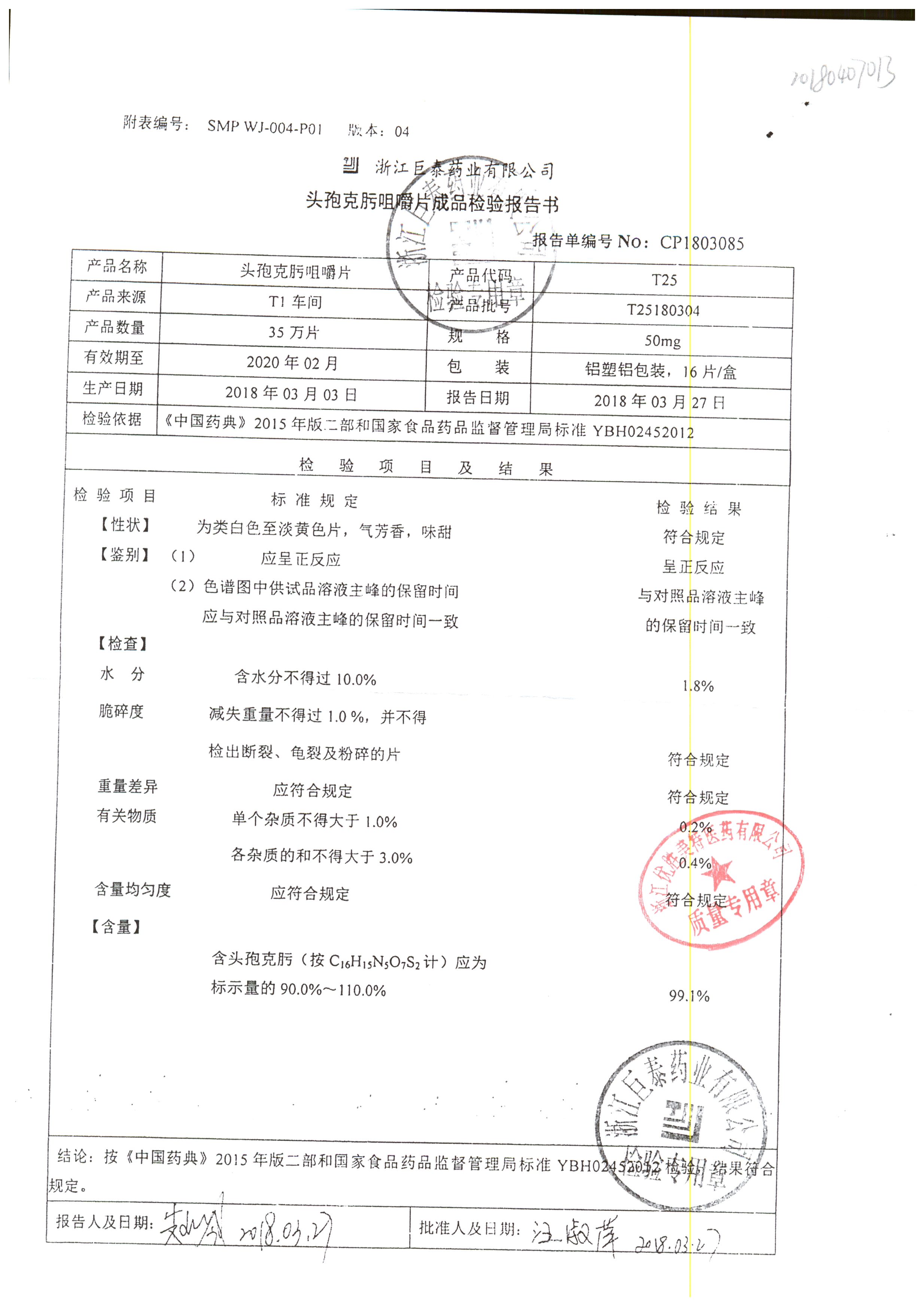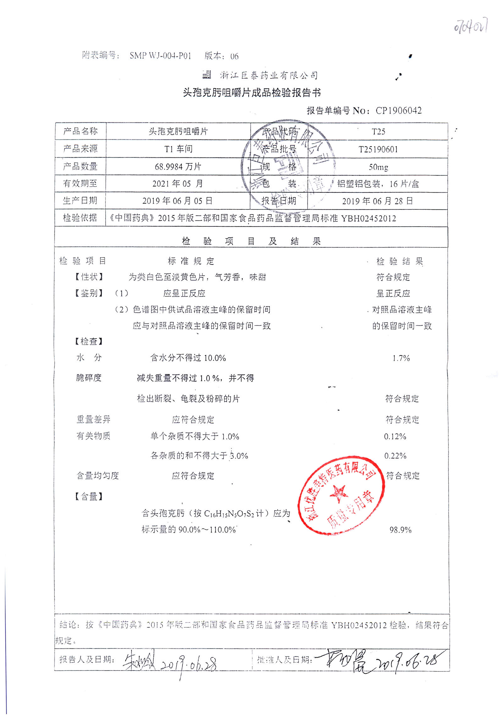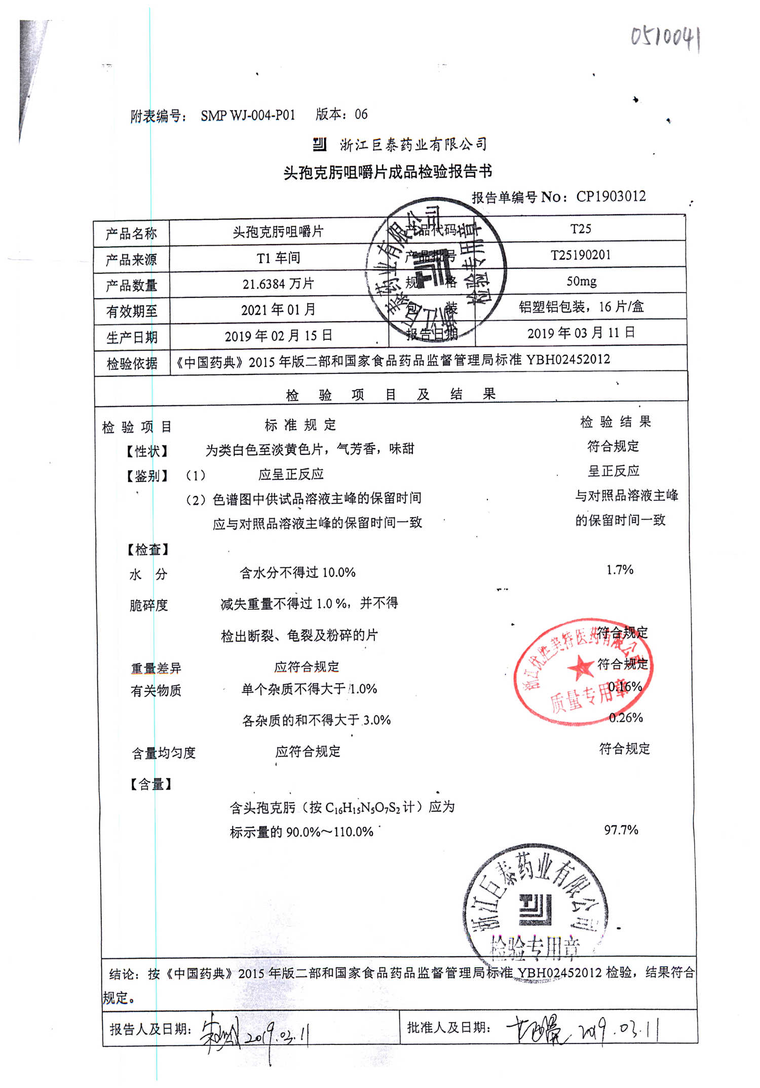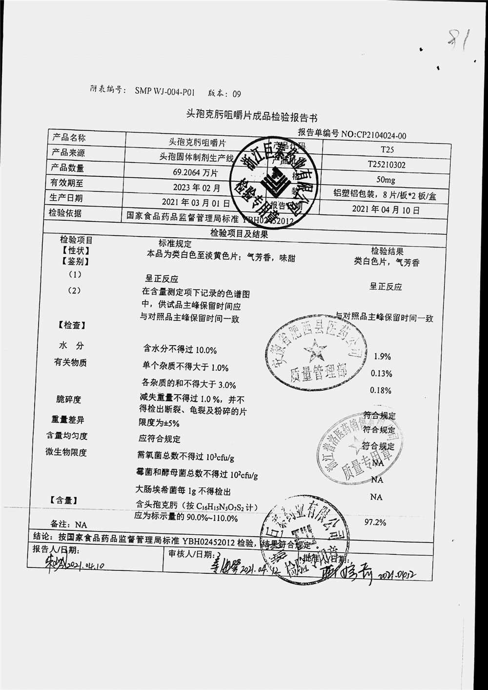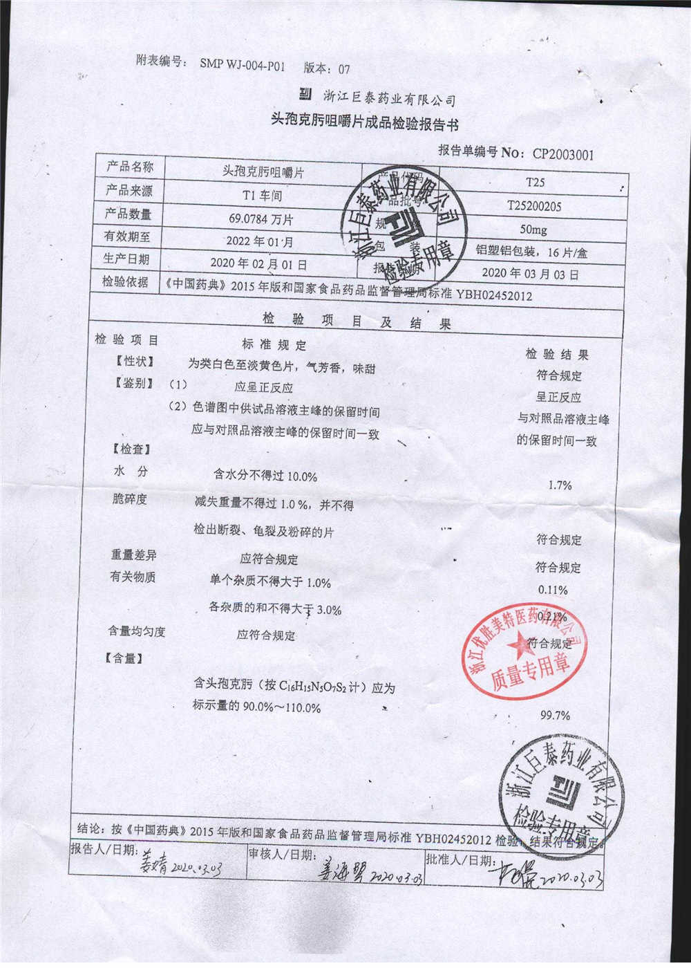 | 頭孢克肟咀嚼片 | 50mg*16s | T25220201/1 | 查看詳情 |