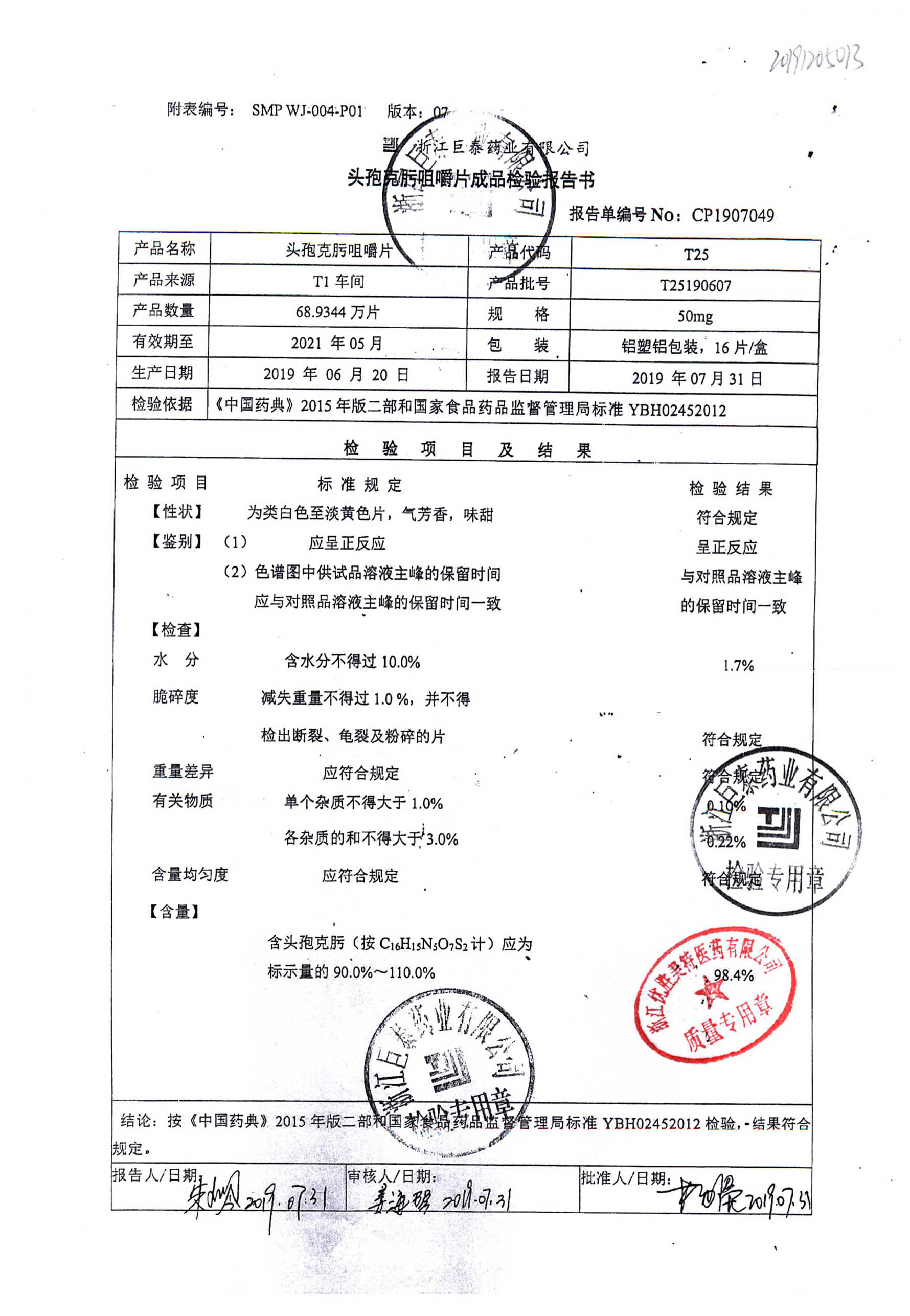 | 頭孢克肟咀嚼片 | 50mg*16s | T25201114 | 查看詳情 |