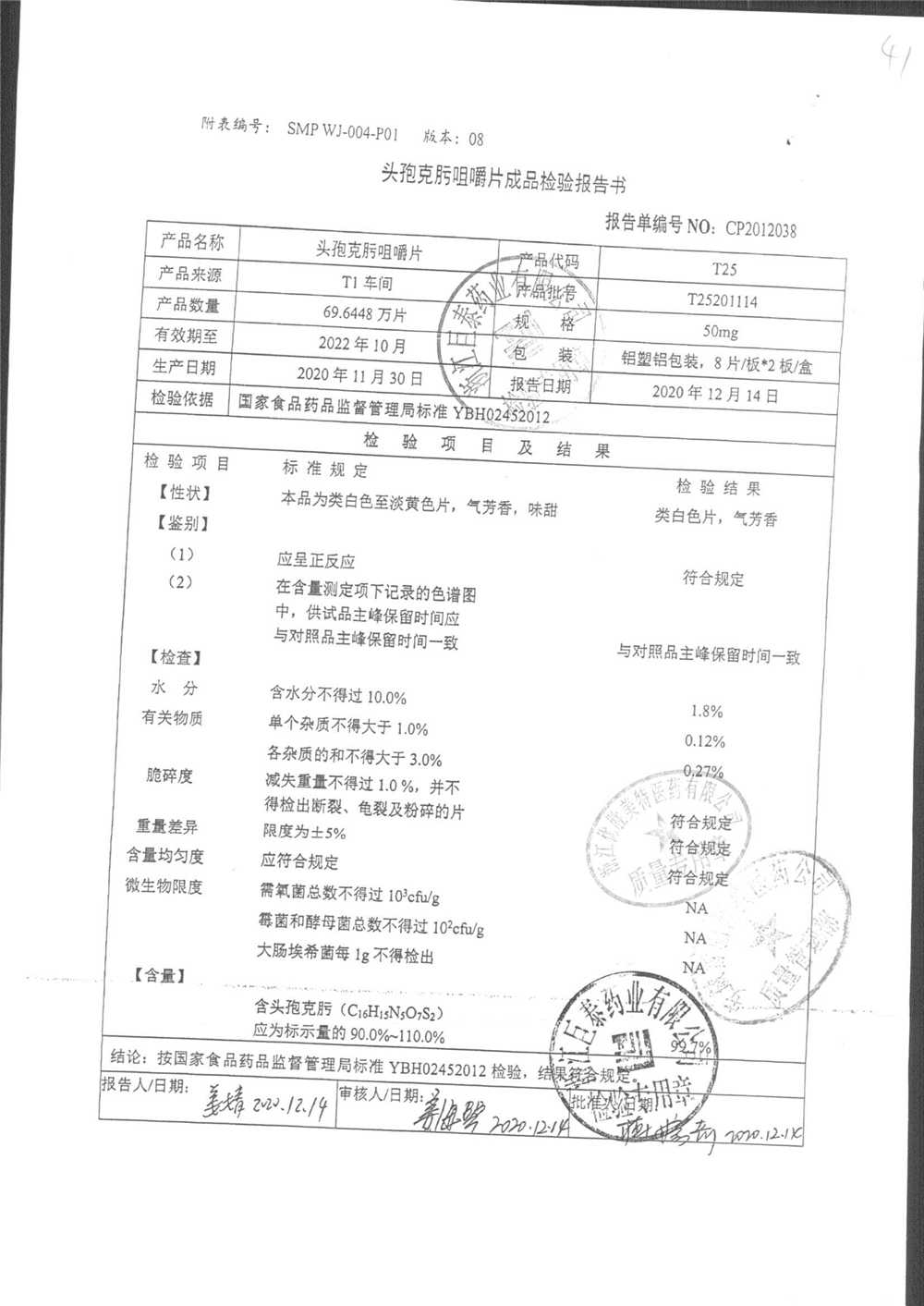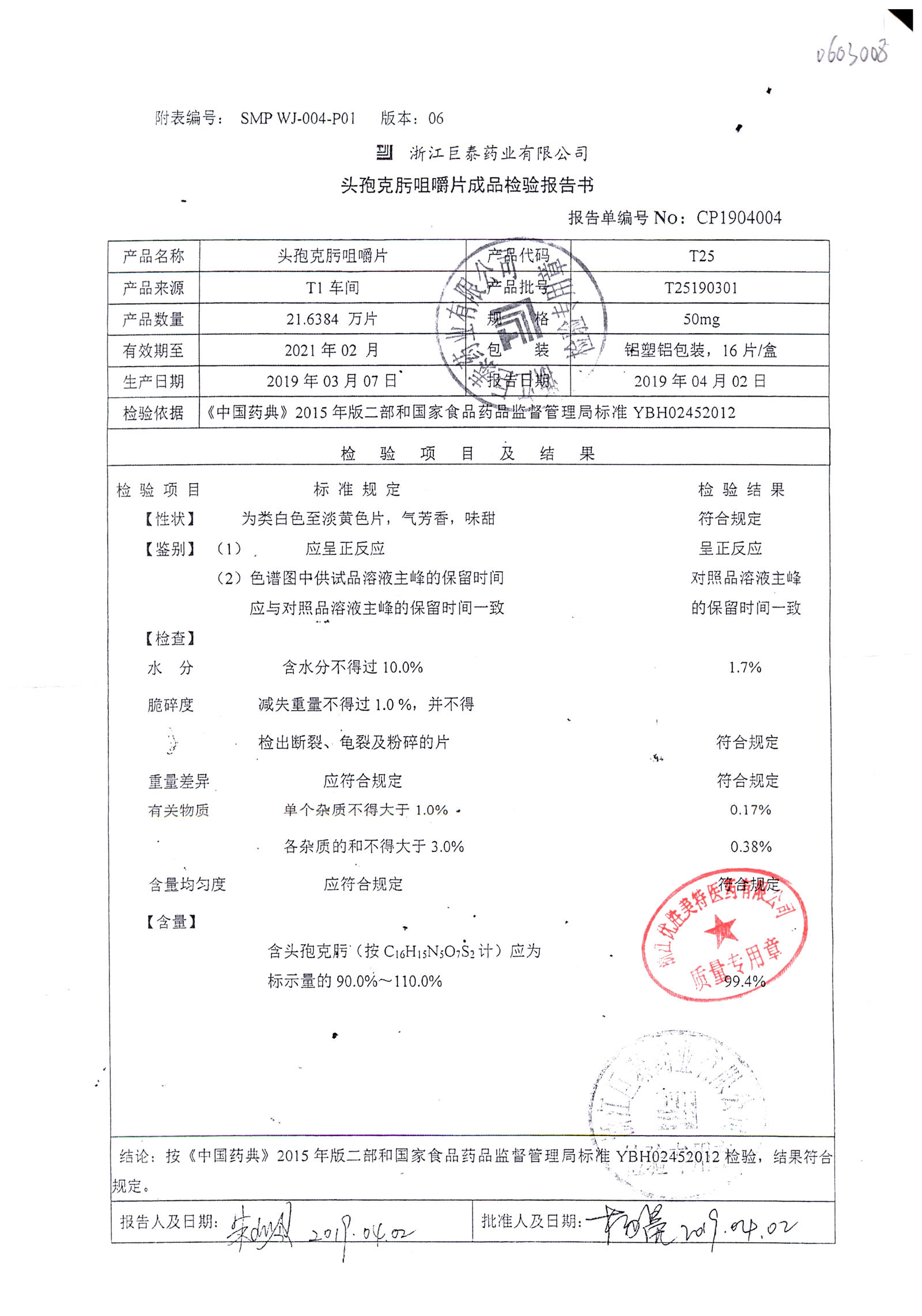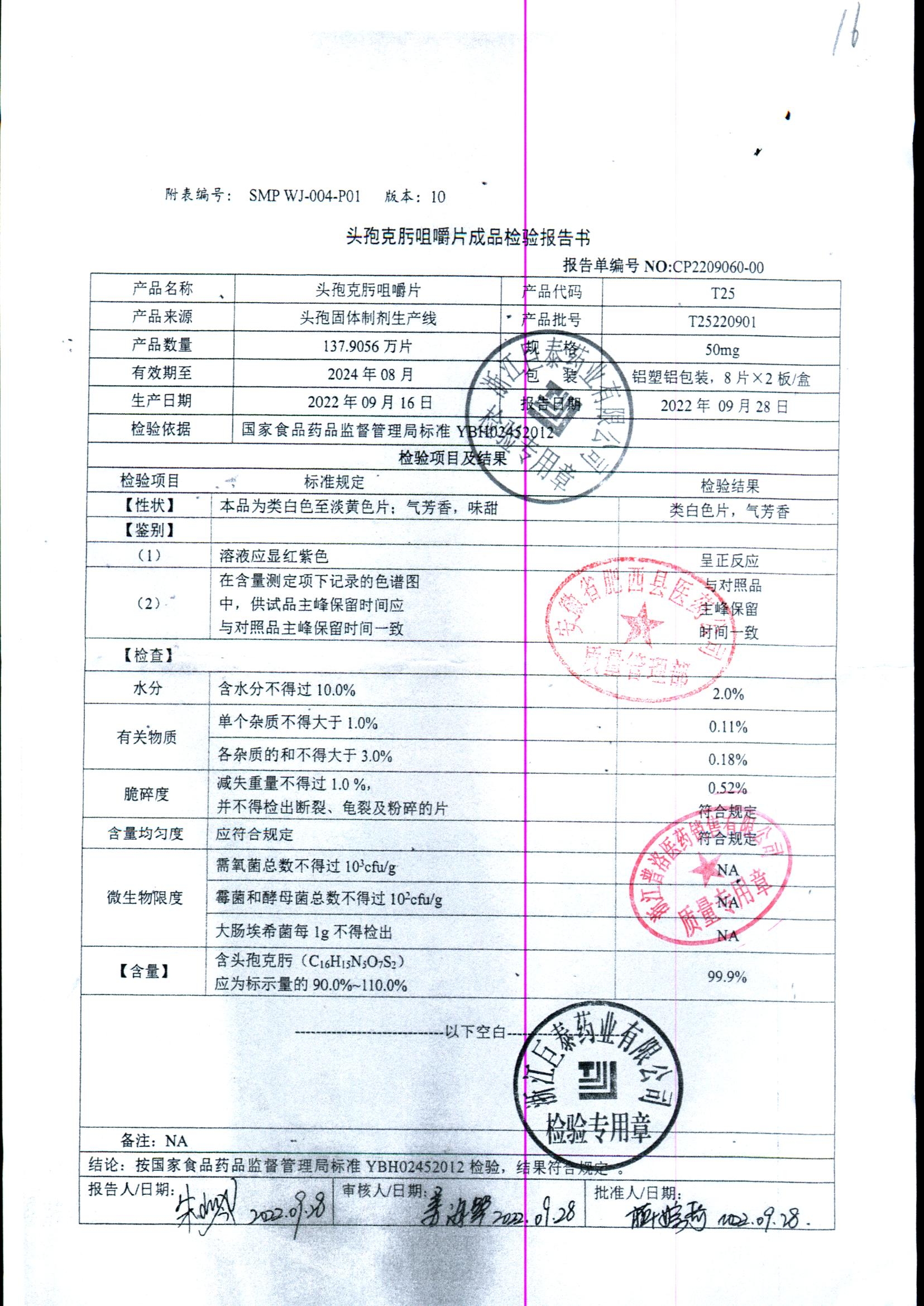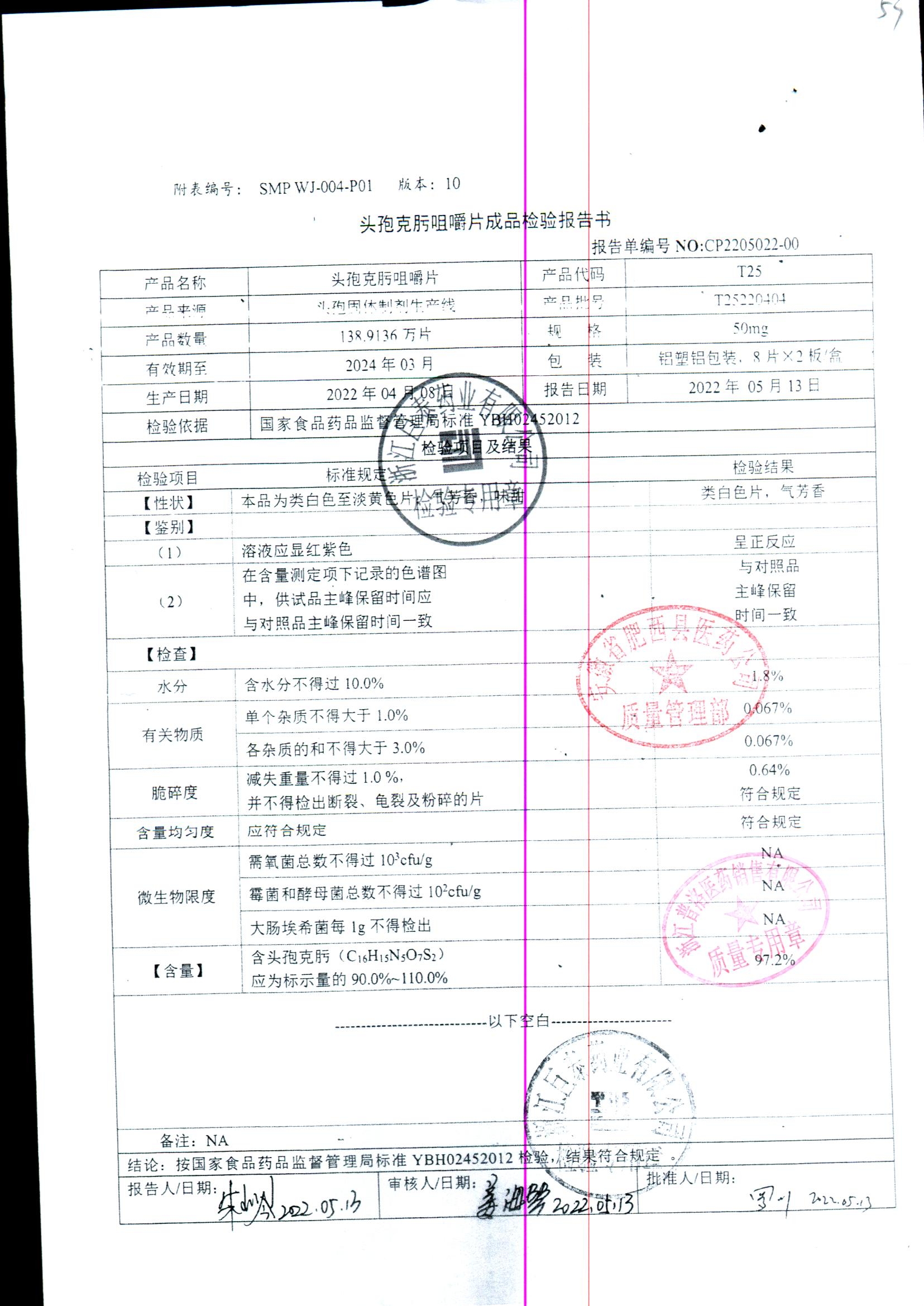 | 頭孢克肟咀嚼片 | 50mg*16s | T25210203 | 查看詳情 |