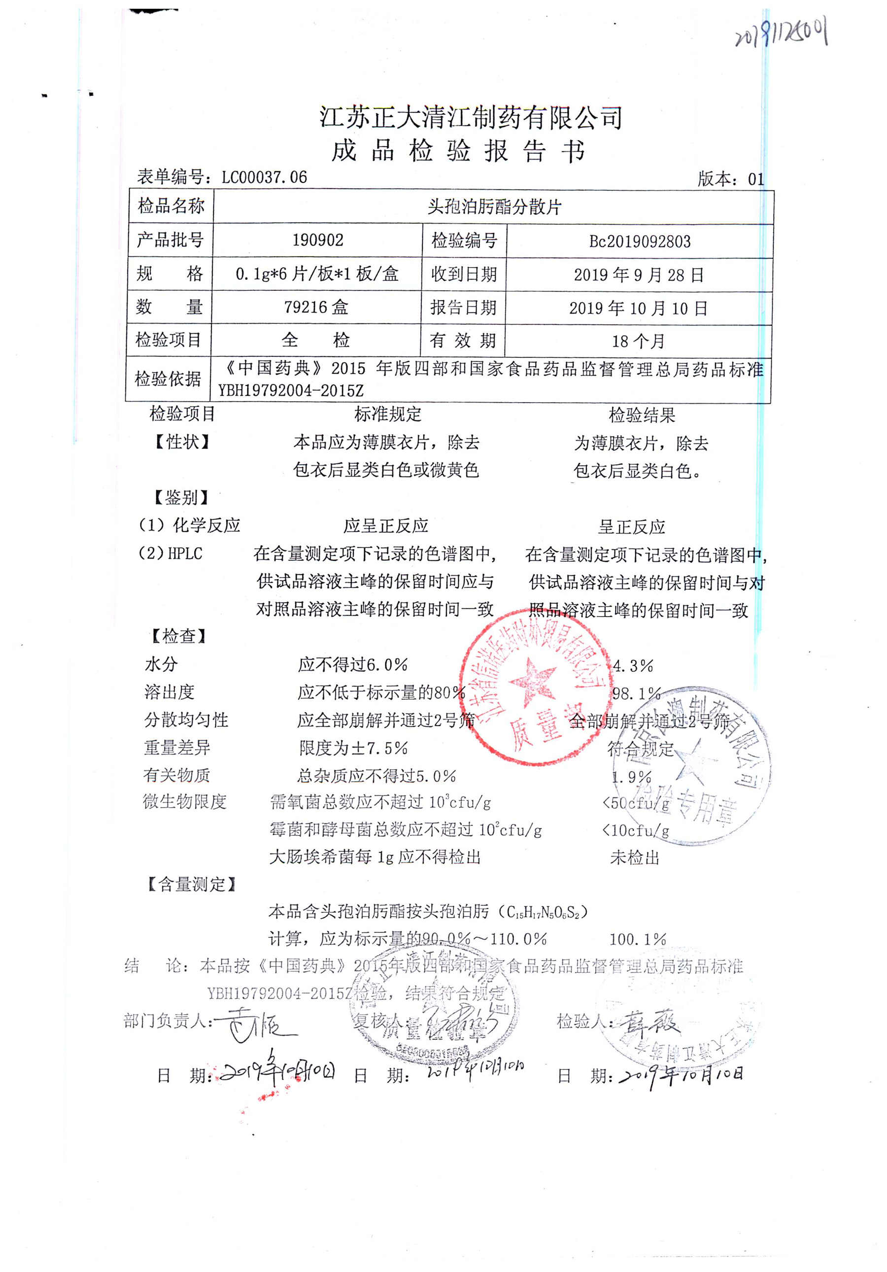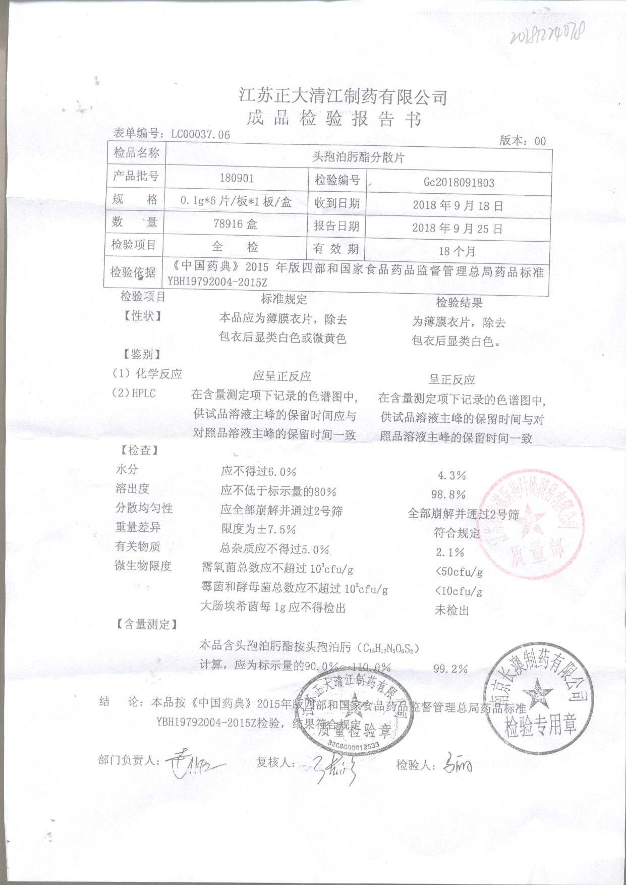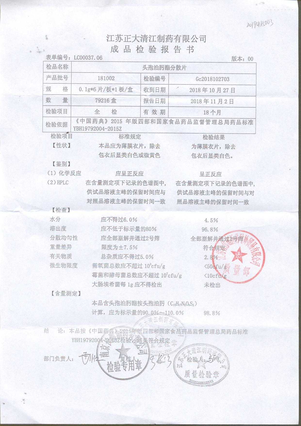 | 頭孢泊肟酯分散片 | 0.1g*6s | 180901 | 查看詳情 |