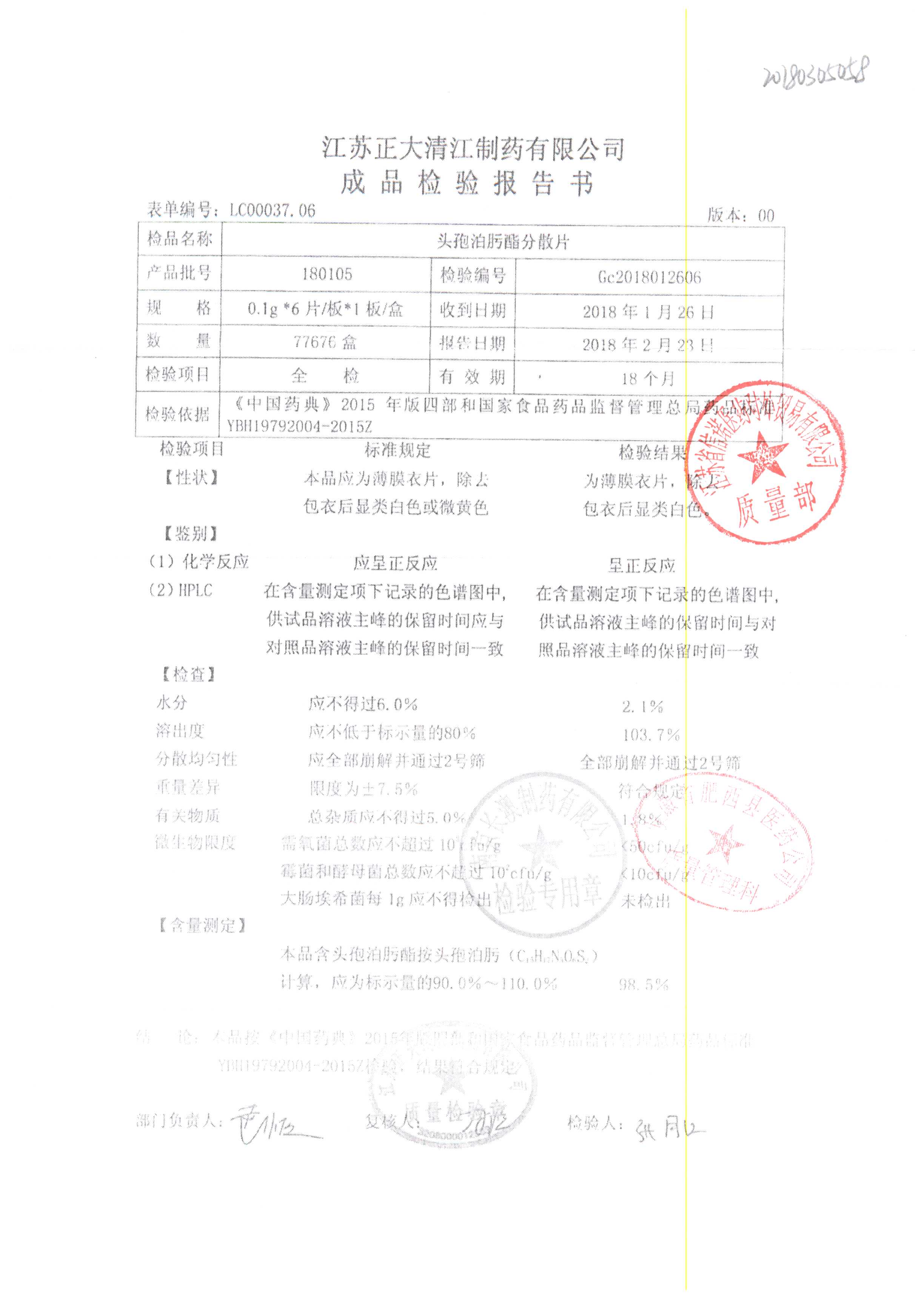 | 頭孢泊肟酯分散片 | 0.1g*6s | 180105 | 查看詳情 |