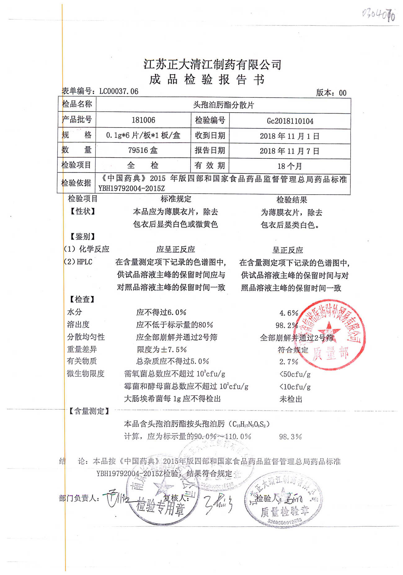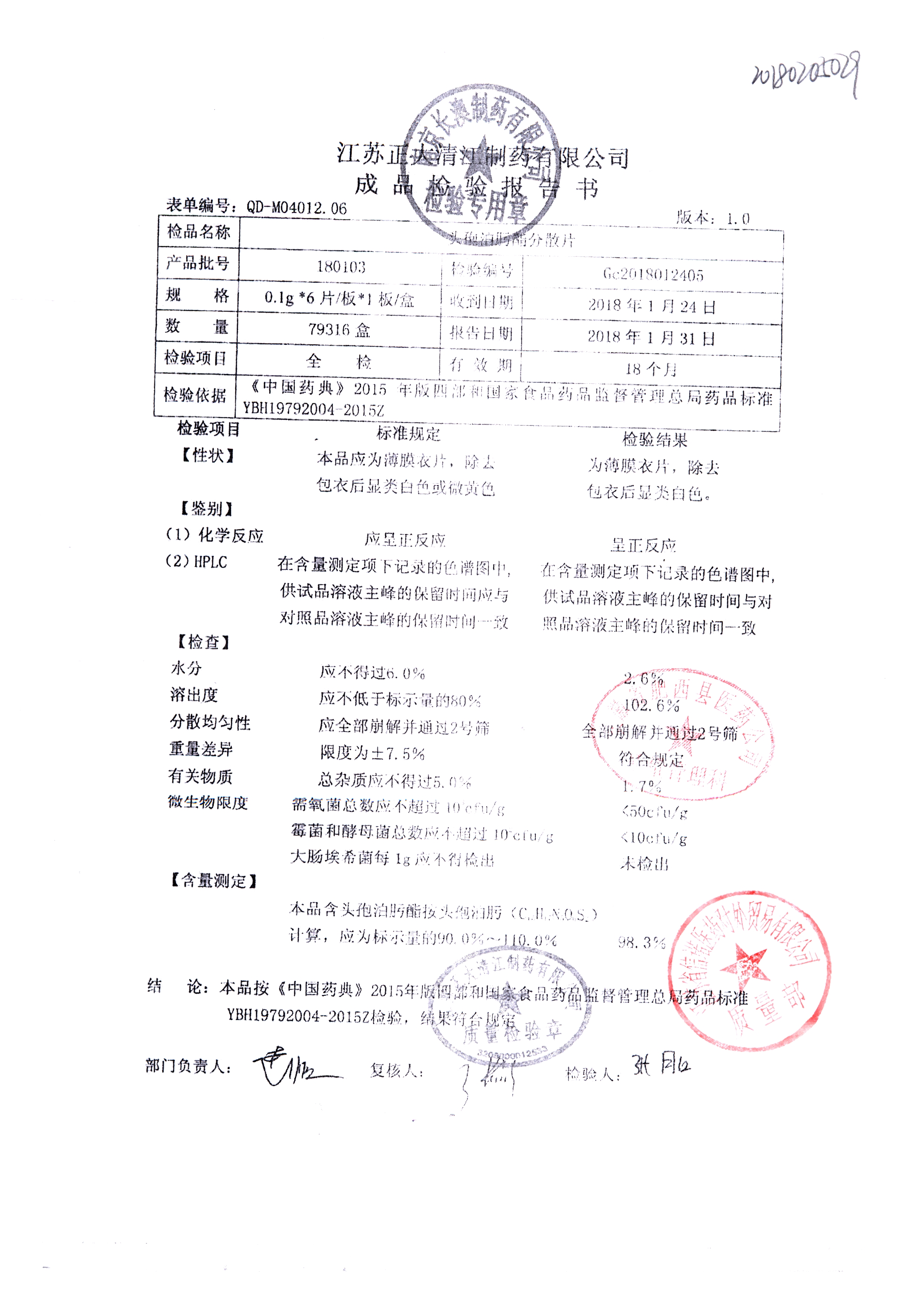 | 頭孢泊肟酯分散片 | 0.1g*6s | 180304 | 查看詳情 |