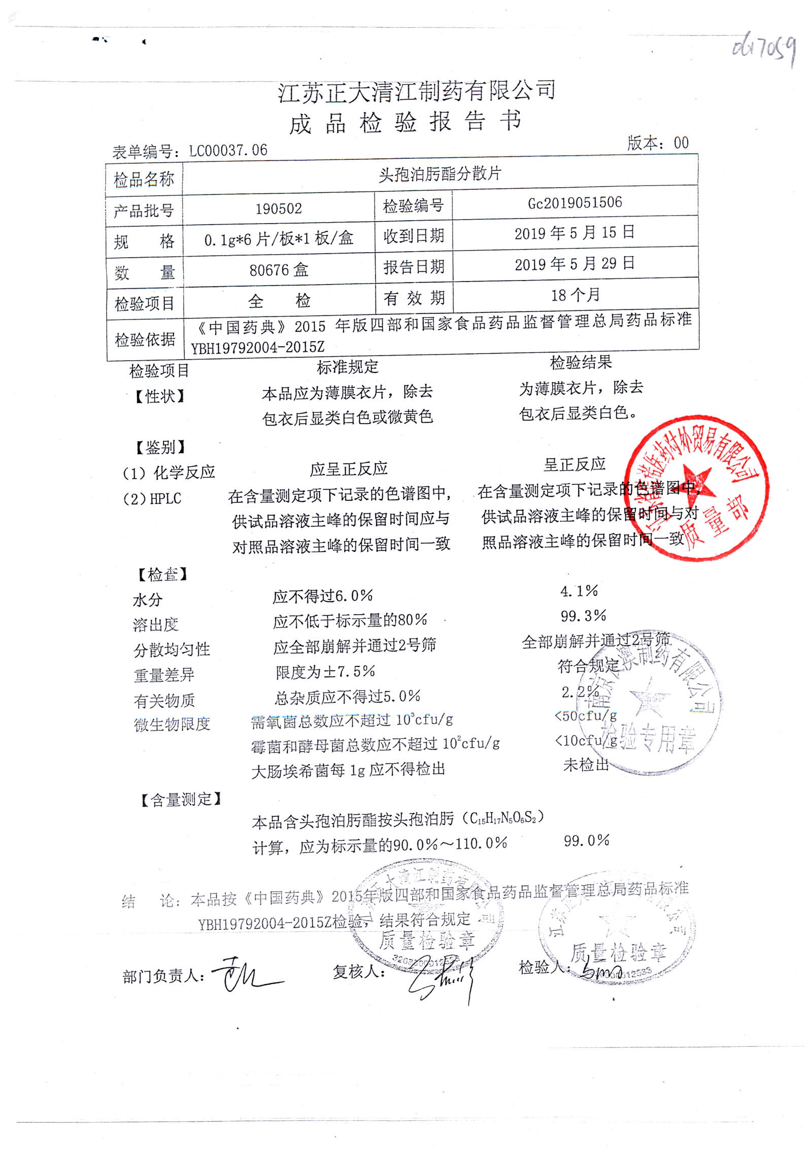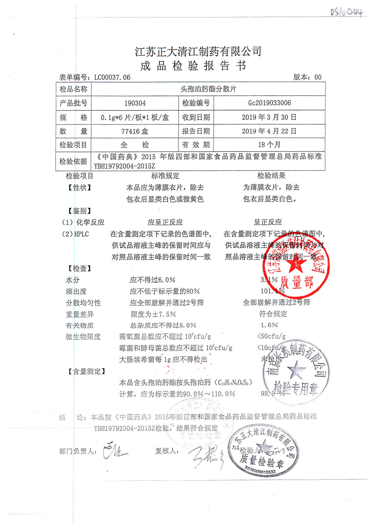 | 頭孢泊肟酯分散片 | 0.1g*6s | 190506 | 查看詳情 |