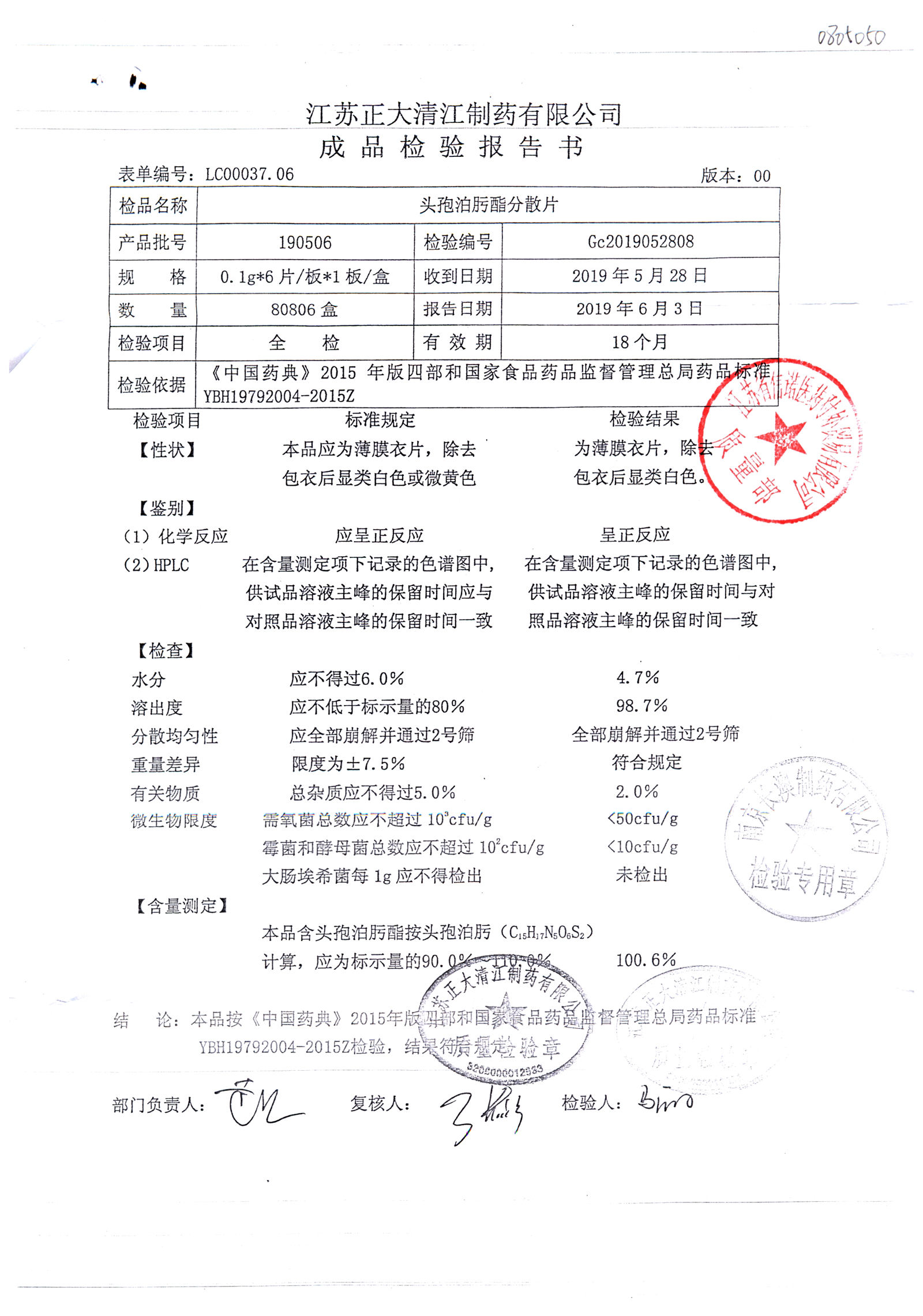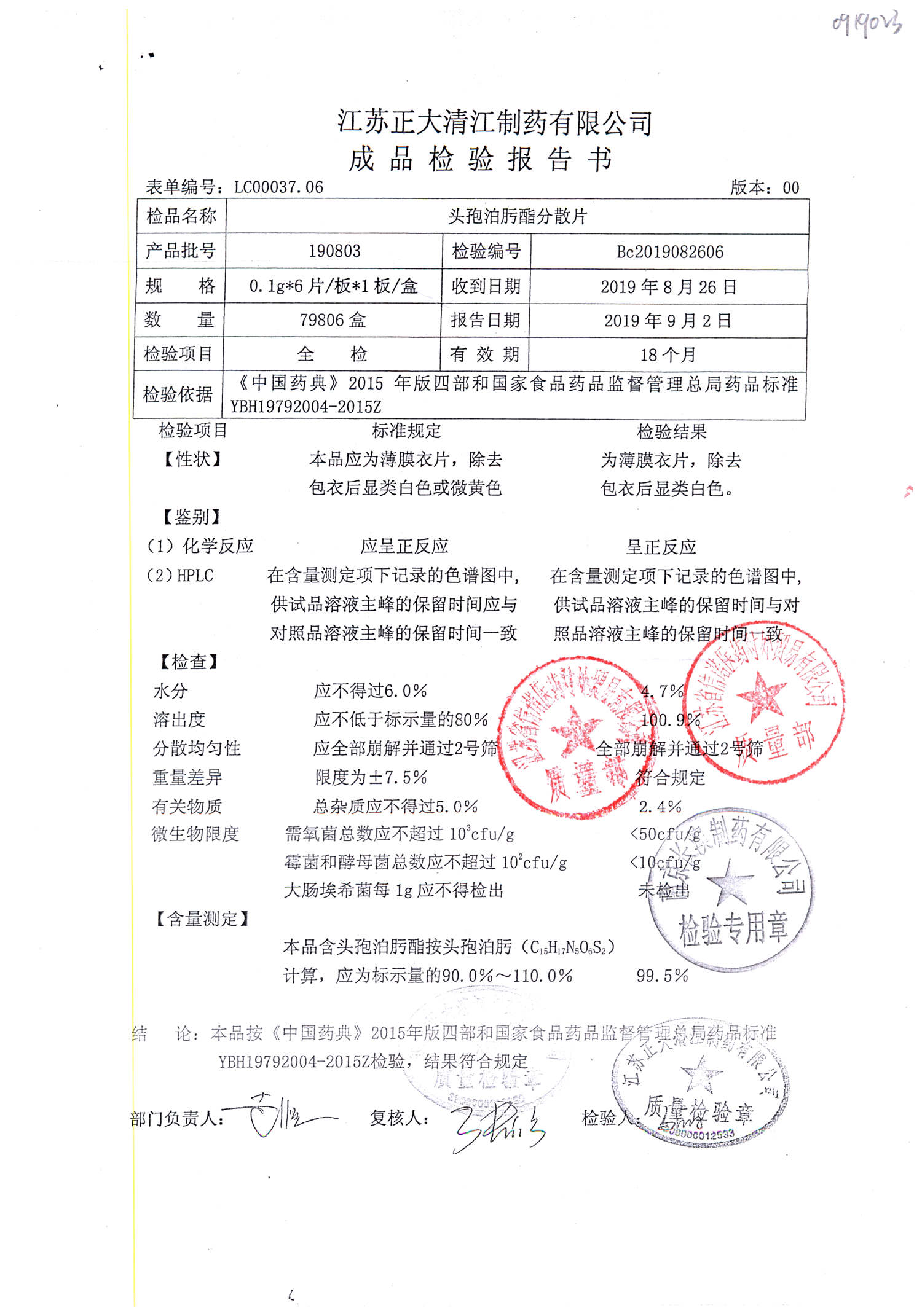 | 頭孢泊肟酯分散片 | 0.1g*6s | 190803 | 查看詳情 |