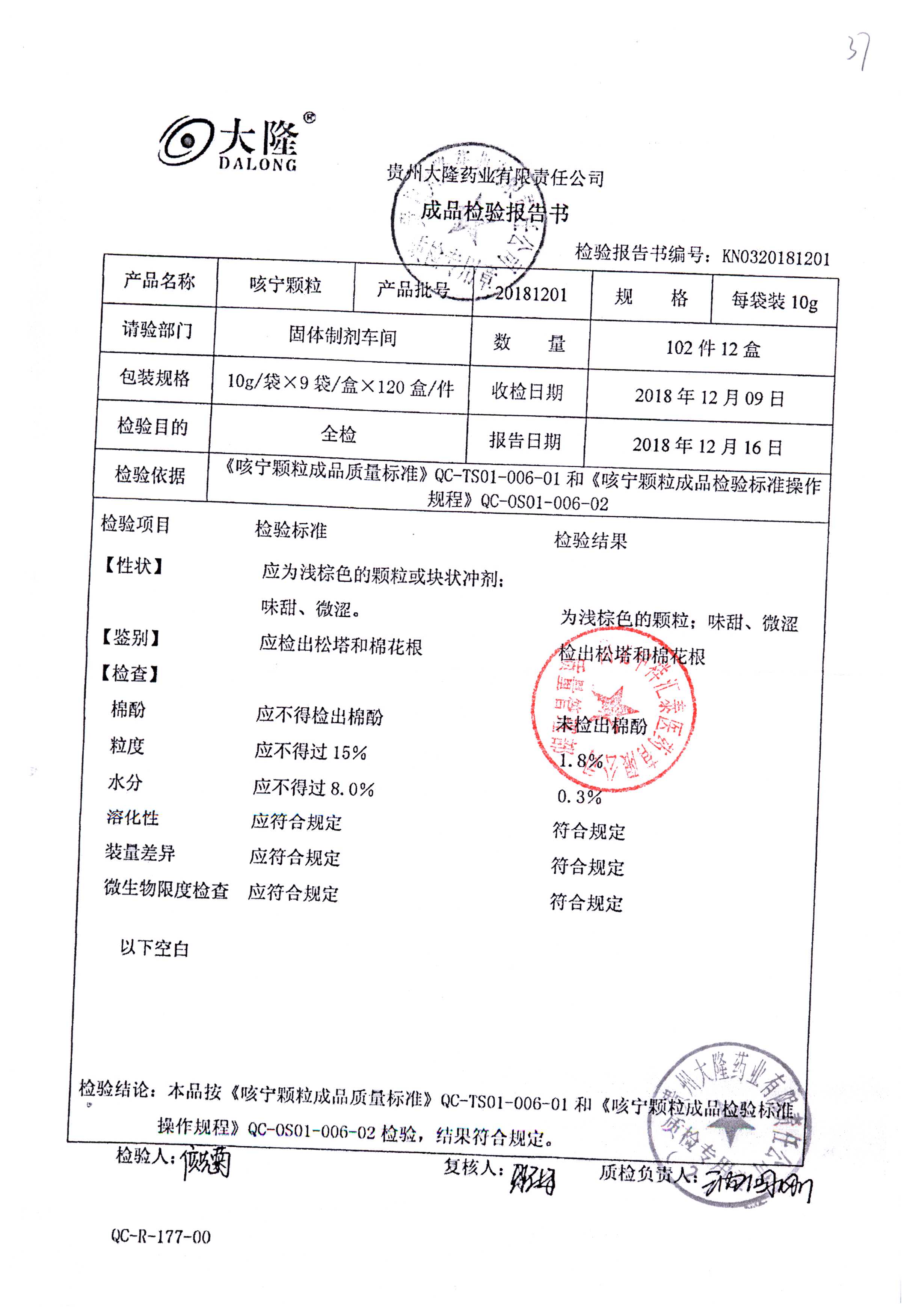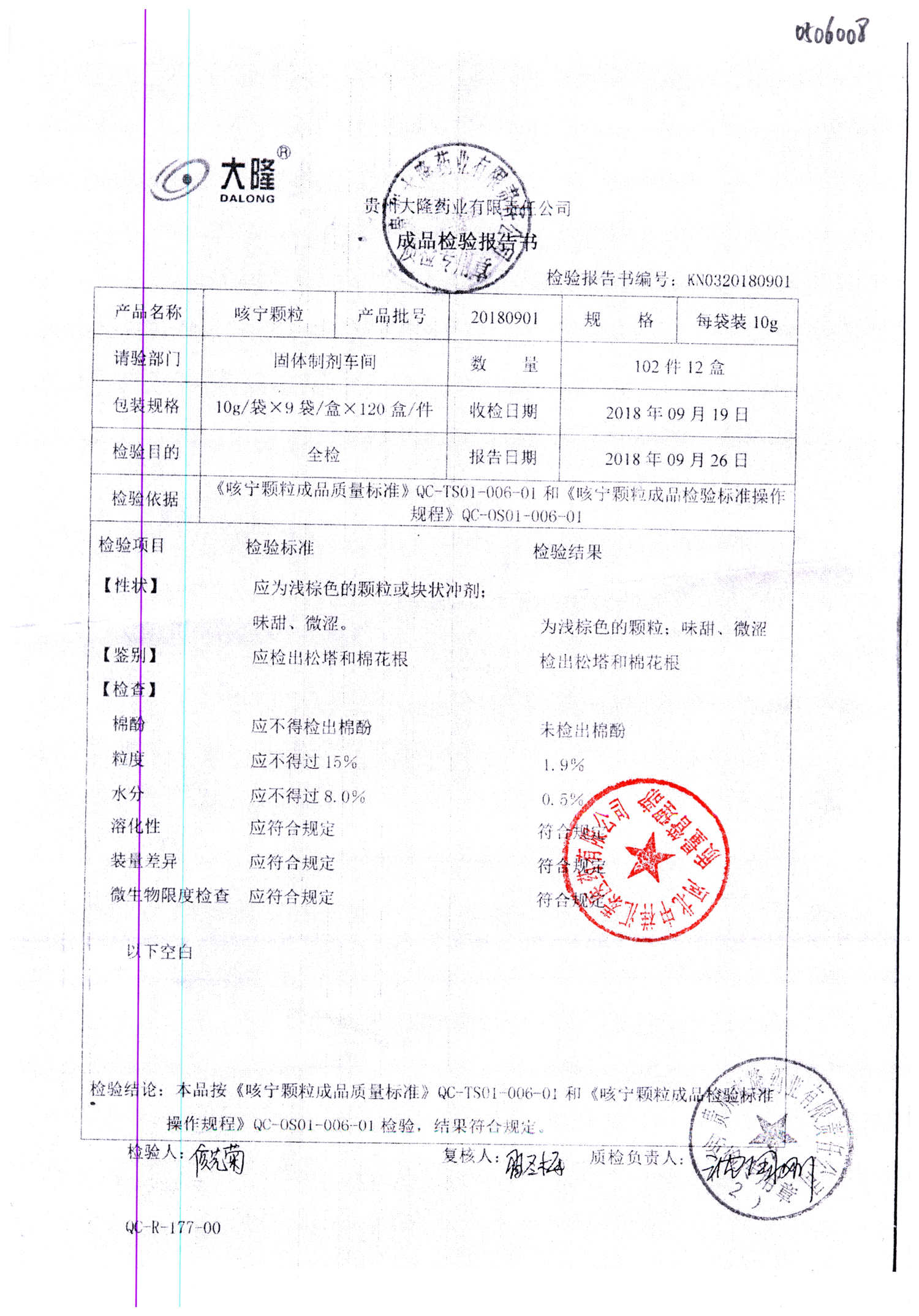 | 咳寧顆粒 | 10g*9袋 | 20181201 | 查看詳情 |